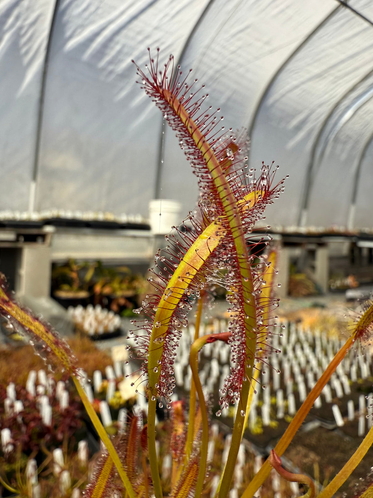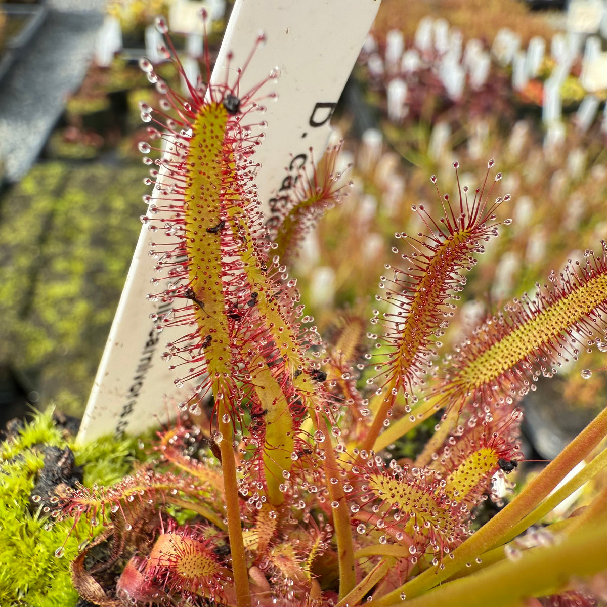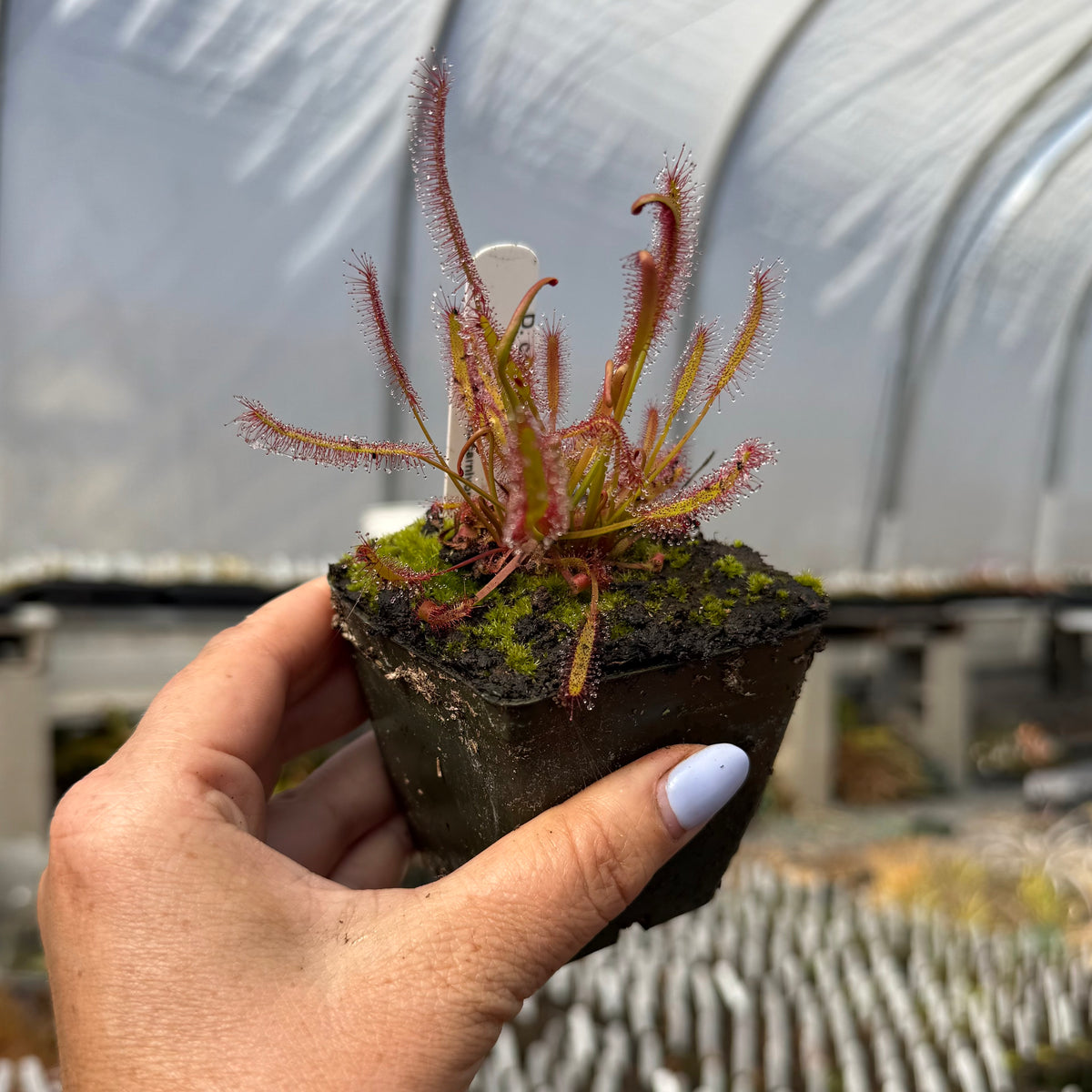 Sun: Full sun. Grow indoors on a sunny windowsill, in a terrarium under lights, or outdoors. If grown indoors, Drosera will require full sun to produce their sticky dew, so be sure to place them in a window where they will receive direct sunlight for most of the day. If grown under lights, keep your grow lights on a 10 to 12-hour day length and hang your grow lights 6 to 10 inches above the plants on the quality of your lights. Grown outdoors, these plants will enjoy a great deal of sun. If you live somewhere extremely hot, for example, Arizona, you will want to protect them from the Full intensity of the afternoon sunlight. You can either grow them in morning sun only, or use shade cloth to help protect them in these very hot areas. These plants may be more colorful and smaller when grown outdoors because the light is more intense. You can expect a few leaves to burn back when you first place your plant outdoors in the sun, and if you receive your plant in the summer, it is a good idea to slowly acclimate it to the sunlight over a day or two. Even in less sunny seasons, areas, or with acclimation, you can still expect to see some burned leaves when first placed outside. This is normal, and new leaves will grow that are more adjusted to the sun. In winter, when grown in sunlight, indoors or outdoors, it is very normal for color to fade from red varieties due to less sun. IF YOUR SUNDEW IS NOT PRODUCING DEW, IT MOST LIKELY NEEDS MORE SUNLIGHT. It can also take a few weeks after shipping for dew to generate.