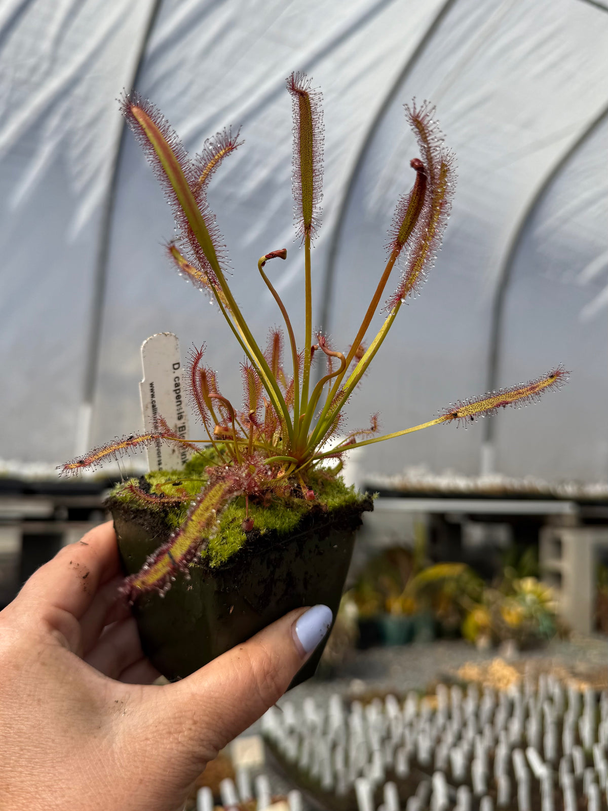 Temperature and Dormancy: Drosera capensis tolerate a wide range of temperatures but will be happiest in 40 - 80 degrees. They can take temperatures from freezing to 100 degrees but only for short periods and can grow back from the roots after a freeze if the daytime temperatures increase above 40. Drosera capensis do not need a dormancy but will die back or slow growth in winter depending on the conditions they are exposed to. If exposed to freezes, they will die back. And many will slow their growth or grow smaller in winter. Drosera capensis does need a nighttime drop in temperatures of 10-20 degrees; if you’d like to grow this in a tropical zone, we recommend the ‘Alba’ cultivar as it can tolerate no nighttime drop in temperature.