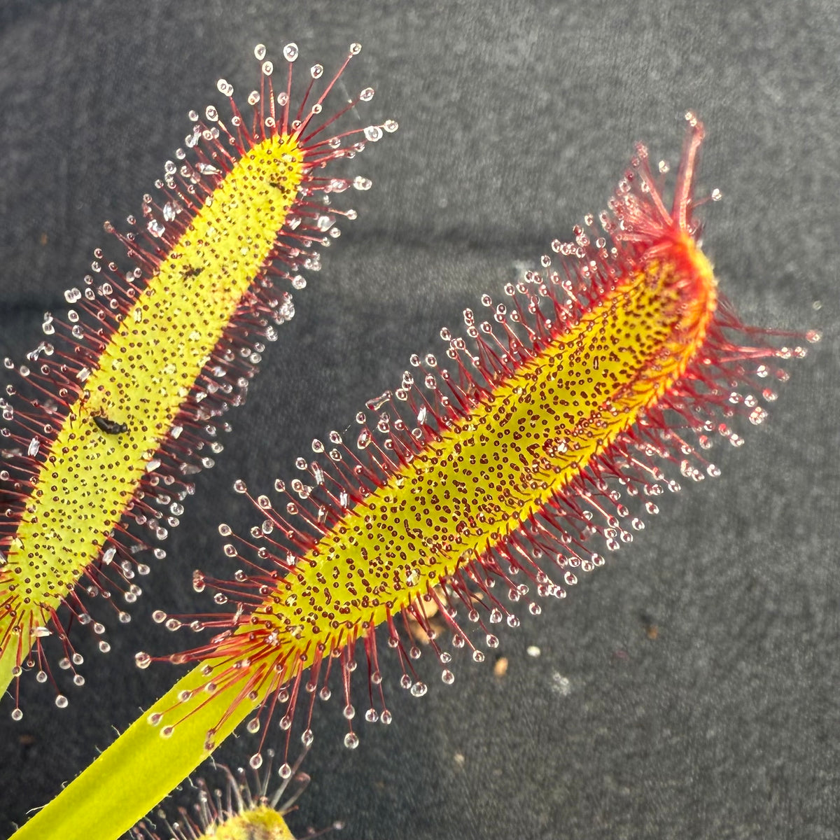 Feeding and Fertilizer: Drosera catch small insects like fungus gnats and fruit flies in their sticky dew. They can catch bigger prey like houseflies or crane flies and can slowly curl their leaves around these larger bugs to make better contact. Over time, their leaves will produce enzymes to digest the nutrients from the bug, absorbing them through their leaves, leaving only the exoskeleton on their sticky leaves. There’s no need to remove these as they often serve as a lure to other insects looking for an easy meal. When grown outdoors, they will catch plenty of food. When grown indoors, they will significantly benefit from a foliar fertilizer. Plants grown outdoors will appreciate a foliar feed as well. Apply MaxSea fertilizer once per month to the foliage only. Dilute 1/4 teaspoon of MaxSea into one gallon of water with a mister bottle or a watering can. Watch as the Drosera slowly curl their leaves after a foliar fertilizer application!