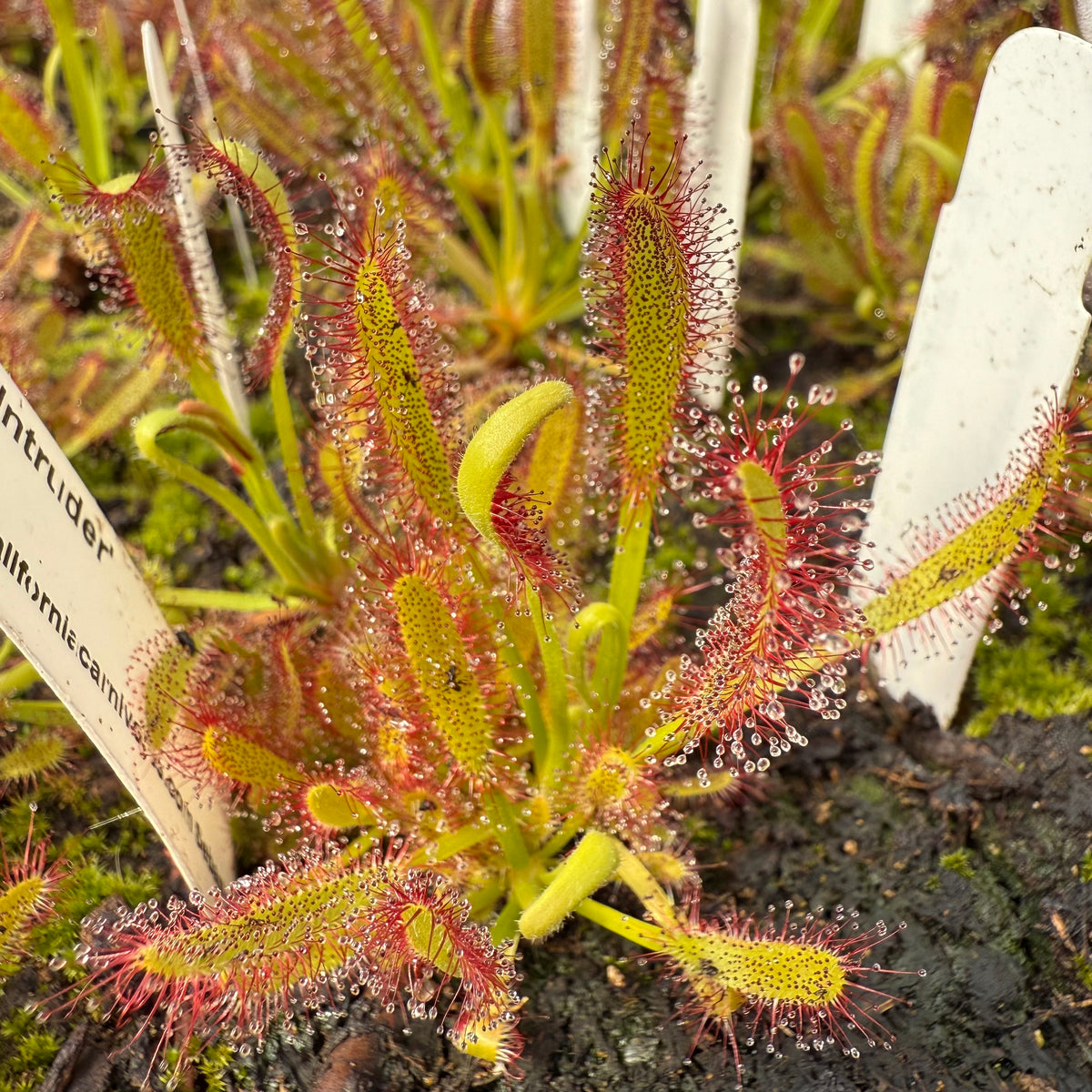 Drosera x “Intruder” is a beautiful cross between two easy-to-grow South African sundews: Drosera capensis and Drosera aliciae. The result is a hybrid similar to Drosera capensis but with a wider leaf and more compact growth habit. First photo from Diflora.