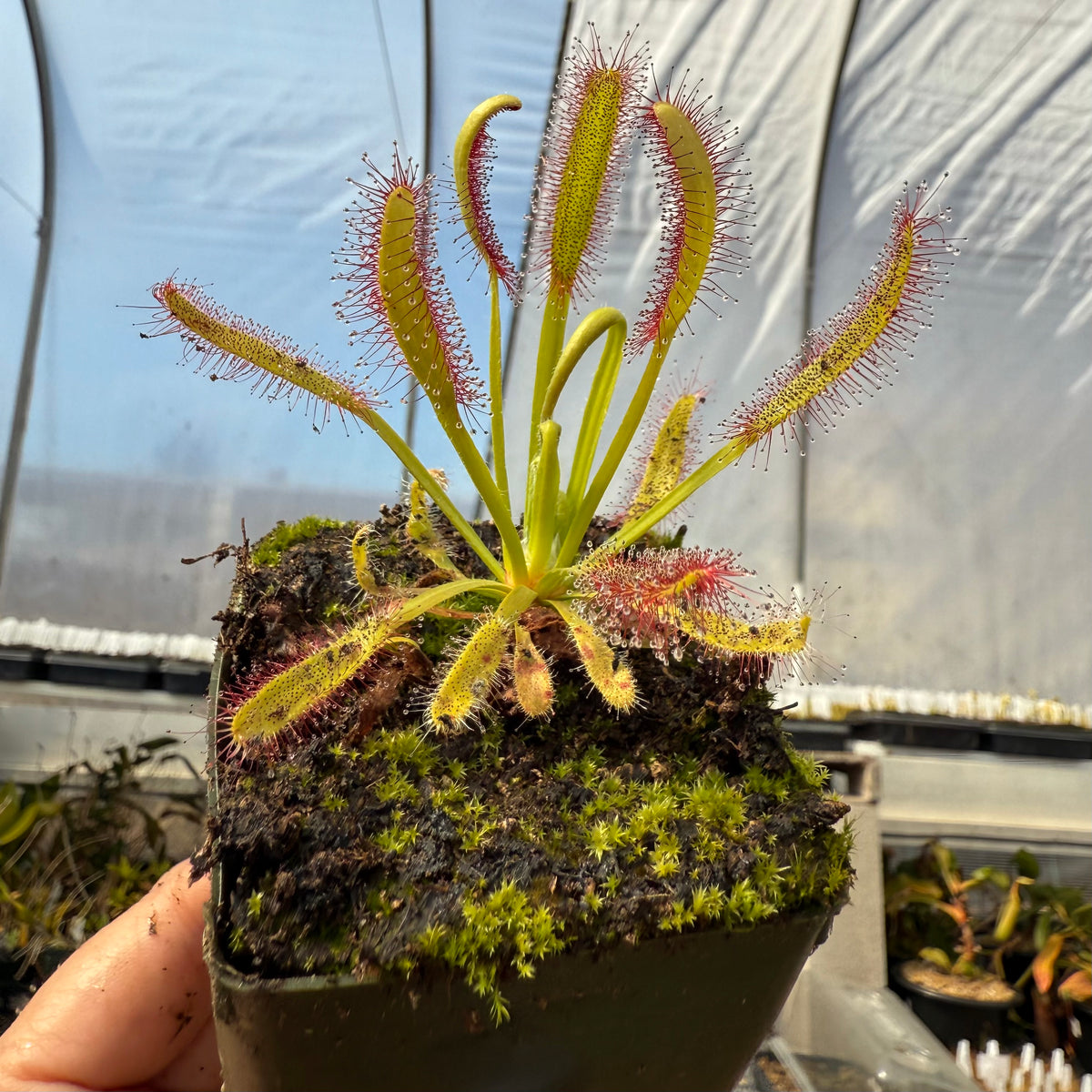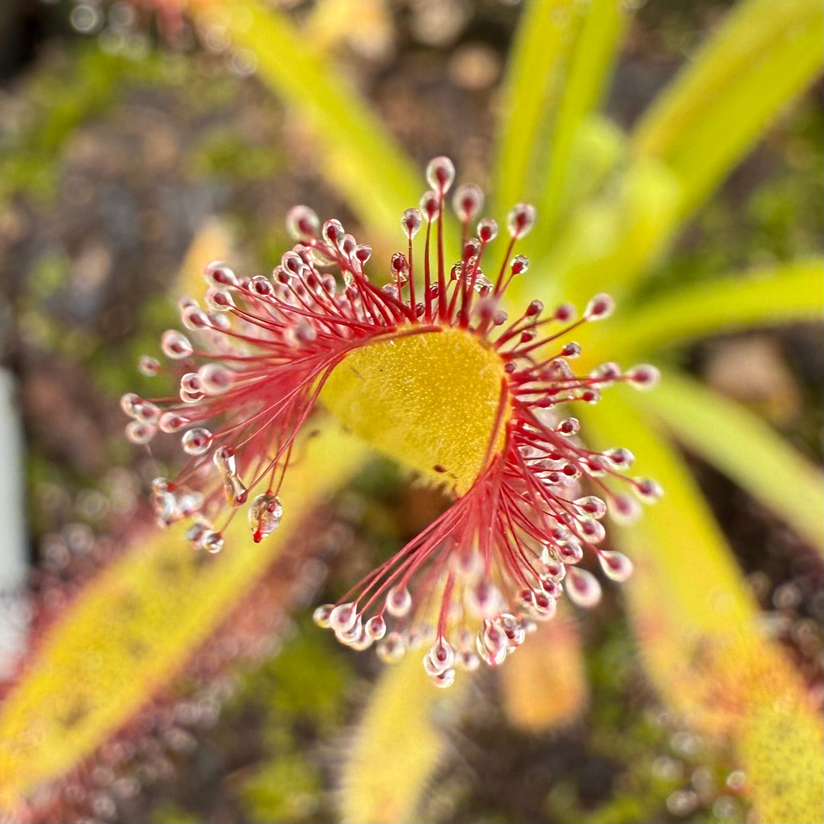 Sun: Full sun. Grow indoors on a sunny windowsill, in a terrarium under lights, or outdoors. If grown indoors, Drosera will require full sun to produce their sticky dew, so be sure to place them in a window where they will receive direct sunlight for most of the day. If grown under lights, keep your grow lights on a 10 to 12-hour day length and hang your grow lights 6 to 10 inches above the plants on the quality of your lights. Grown outdoors, these plants will enjoy a great deal of sun. If you live somewhere extremely hot, for example, Arizona, you will want to protect them from the Full intensity of the afternoon sunlight. You can either grow them in morning sun only, or use shade cloth to help protect them in these very hot areas. These plants may be more colorful and smaller when grown outdoors because the light is more intense. You can expect a few leaves to burn back when you first place your plant outdoors in the sun, and if you receive your plant in the summer, it is a good idea to slowly acclimate it to the sunlight over a day or two. Even in less sunny seasons, areas, or with acclimation, you can still expect to see some burned leaves when first placed outside. This is normal, and new leaves will grow that are more adjusted to the sun. In winter, when grown in sunlight, indoors or outdoors, it is very normal for color to fade from red varieties due to less sun. IF YOUR SUNDEW IS NOT PRODUCING DEW, IT MOST LIKELY NEEDS MORE SUNLIGHT. It can also take a few weeks after shipping for dew to generate.