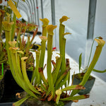 Sun: Full sun. Sarracenia require lots of direct sun to grow and form pitchers properly. In many areas, they can be grown outdoors in full sun. If you live in a very hot AND very dry place like Arizona or Sacramento, for example, you will want to grow your plants in full morning sun with protection from the afternoon sun or under 30% shade cloth. It is common for several pitchers to "burn" and die back when you first place your plant into the sun; your plant is acclimating to your conditions, and in most cases, new leaves will soon grow and be fully acclimated. Sarracenia can be grown indoors on extremely sunny windowsills that receive all-day sun, but they will require a grow light in most circumstances due to the amount of light the plant needs. Grow lights should be 6-12” from the plant, depending on the light, and on a 10-12 hour day length. Sarracenia generally are not a good candidate for a terrarium as they need intense light and get quite tall. Shorter species like Sarracenia purpurea will do better in a terrarium. Grow outdoors if possible for best results.