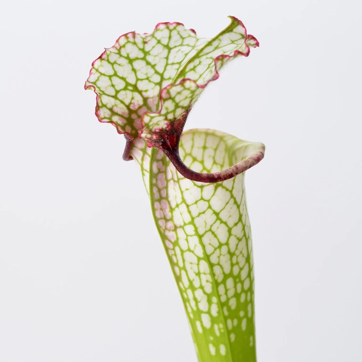 Sarracenia x “Painted Black” combines the famous ‘Leah Wilkerson’ with leucophylla ’Red Throat’. This cultivar has the beautiful coloration of ‘Leah Wilkerson’ when it’s young, but as the pitchers mature, the red blotch at the base of the throat spreads and darkens—it's the deepest, darkest red!