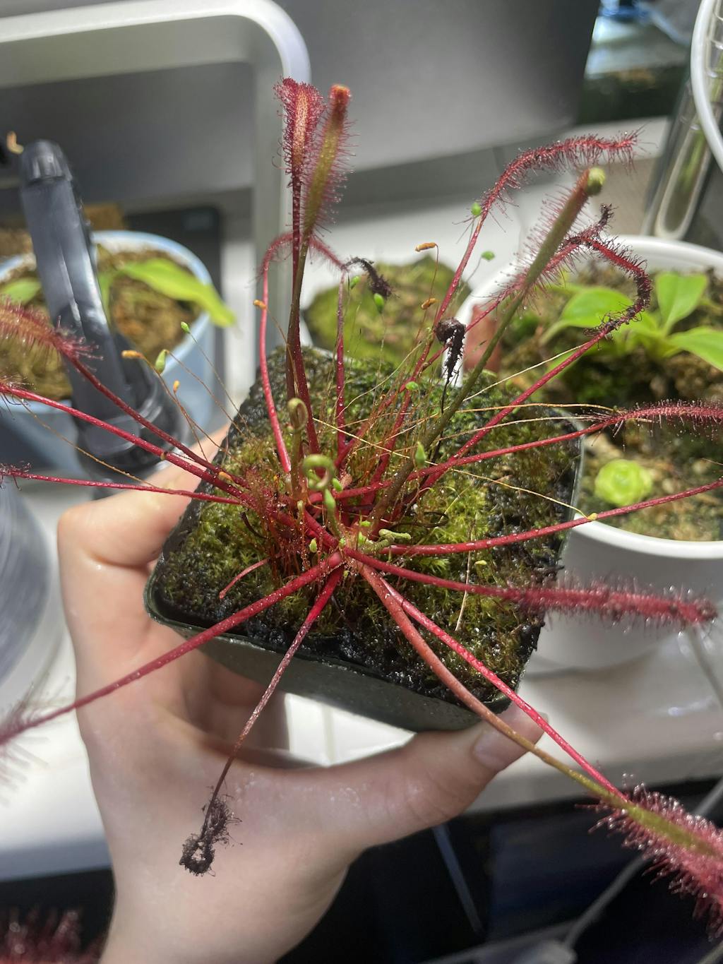 Feeding and Fertilizer: Drosera catch small insects like fungus gnats and fruit flies in their sticky dew. They can catch bigger prey like houseflies or crane flies and can slowly curl their leaves around these larger bugs to make better contact. Over time, their leaves will produce enzymes to digest the nutrients from the bug, absorbing them through their leaves, leaving only the exoskeleton on their sticky leaves. There’s no need to remove these as they often serve as a lure to other insects looking for an easy meal. When grown outdoors, they will catch plenty of food. When grown indoors, they will significantly benefit from a foliar fertilizer. Plants grown outdoors will appreciate a foliar feed as well. Apply MaxSea fertilizer once per month to the foliage only. Dilute 1/4 teaspoon of MaxSea into one gallon of water with a mister bottle or a watering can. Watch as the Drosera slowly curl their leaves after a foliar fertilizer application!