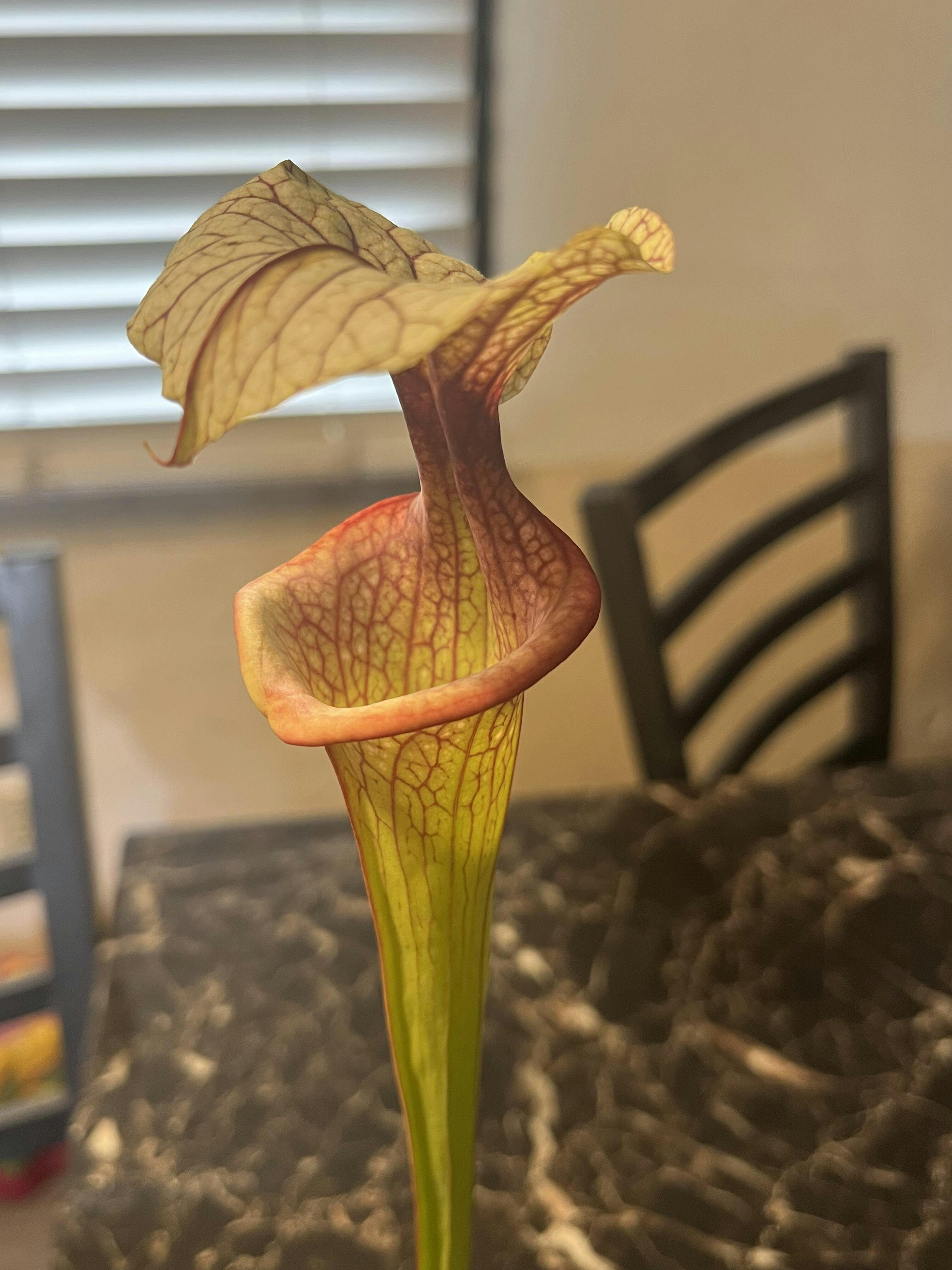 Water: Always keep them in a saucer with a few inches of distilled, rainwater, or reverse osmosis water. Never let them dry out, especially in the hot summer months. Sarracenia are bog plants that prefer water-logged conditions unless you live somewhere both very hot AND extremely humid, like Alabama. In that case, let the water tray dry out for a day or two between refills. Always use distilled, reverse osmosis, or rainwater only. These plants are sensitive to their water quality, and giving them mineral and salt-free water is very important. In winter, when the plants are dormant, you can let them dry out a bit between rain storms, but do not let the soil get so dry that it pulls away from the edges of the pots. Be sure to supplement water as needed in between rains in winter.
