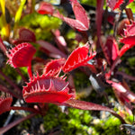 The young plants and early traps of Dionaea m. “All Red Fused Tooth” can look quite normal, but mature traps will form with teeth so fused by late summer that they look like bear traps. This form of fused tooth-style trap is dark red and very rare!