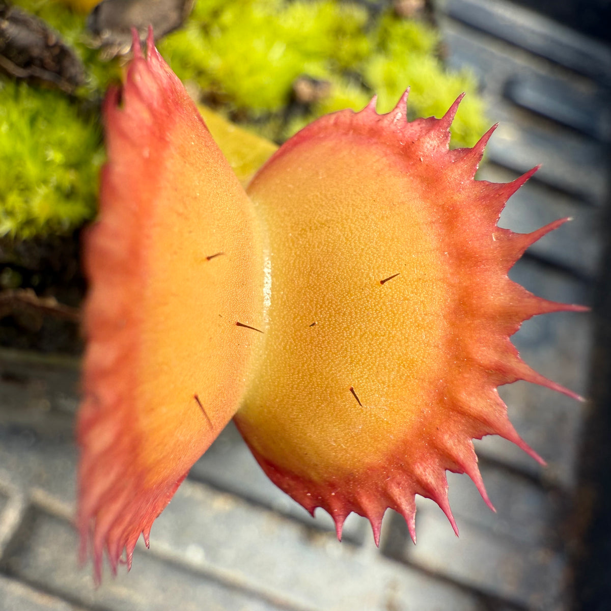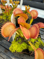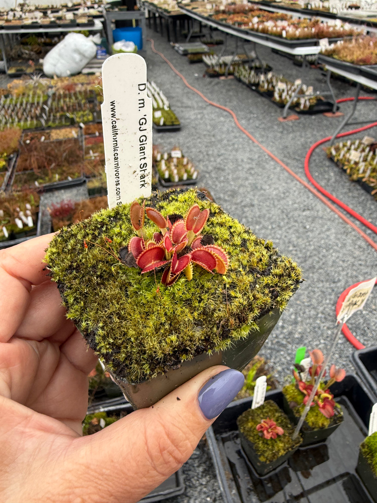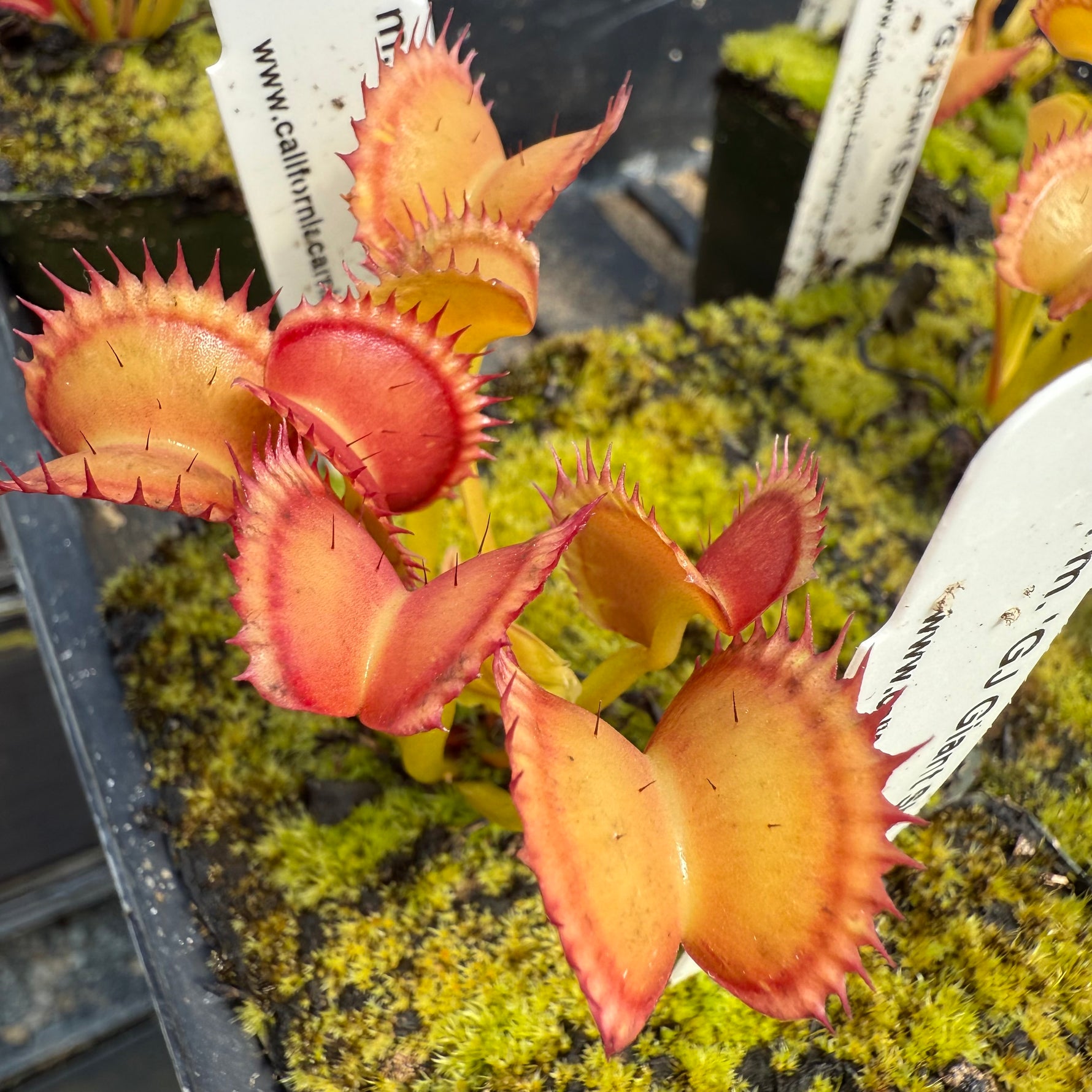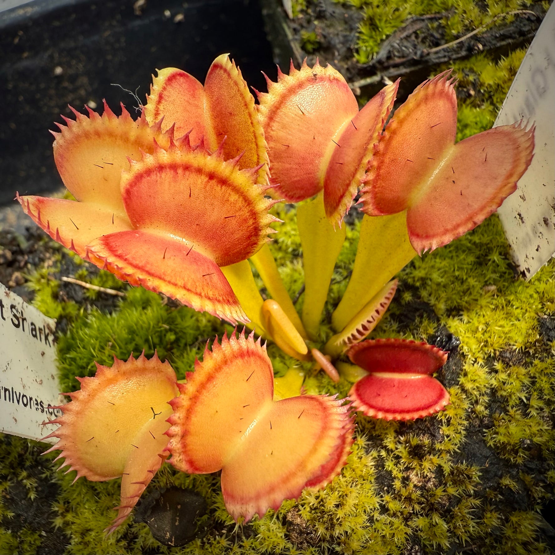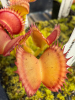 Dionaea m. “GJ Giant Sharm” is a vigorous cultivar from the famous GreenJaws nursery. Its tall, perfectly formed traps have pleasingly symmetrical dentate teeth lining each trap.