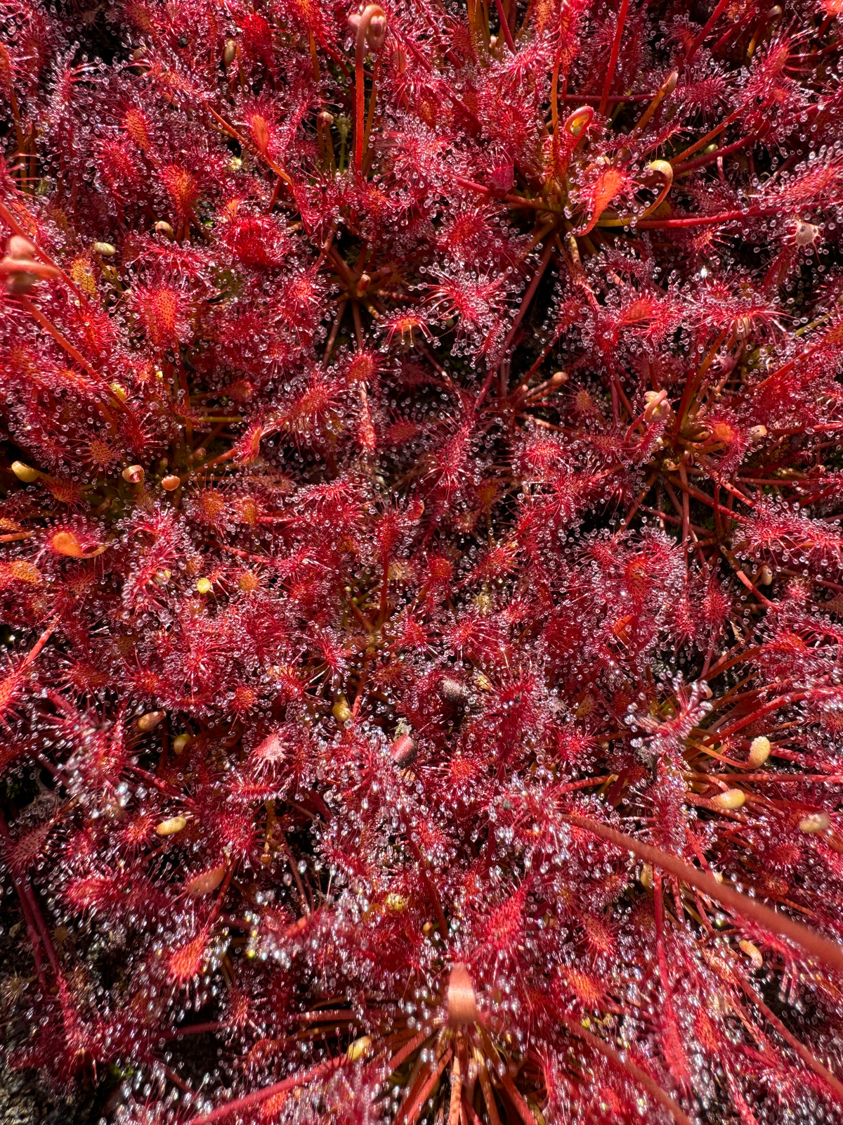 Growth Habit: Drosera intermedia x capillaris forms a lovely rosette of thin petioles with rounded leaves covered in dew. These will grow to 2-3” and form clumps over time. Drosera have high leaf turnover meaning that their leaves die back frequently but new one grow in, you can remove black, dead leaves. This is a sterile hybrid and will not produce viable seed but it easily propagated from leaf cuttings. Drosera have thin black roots.