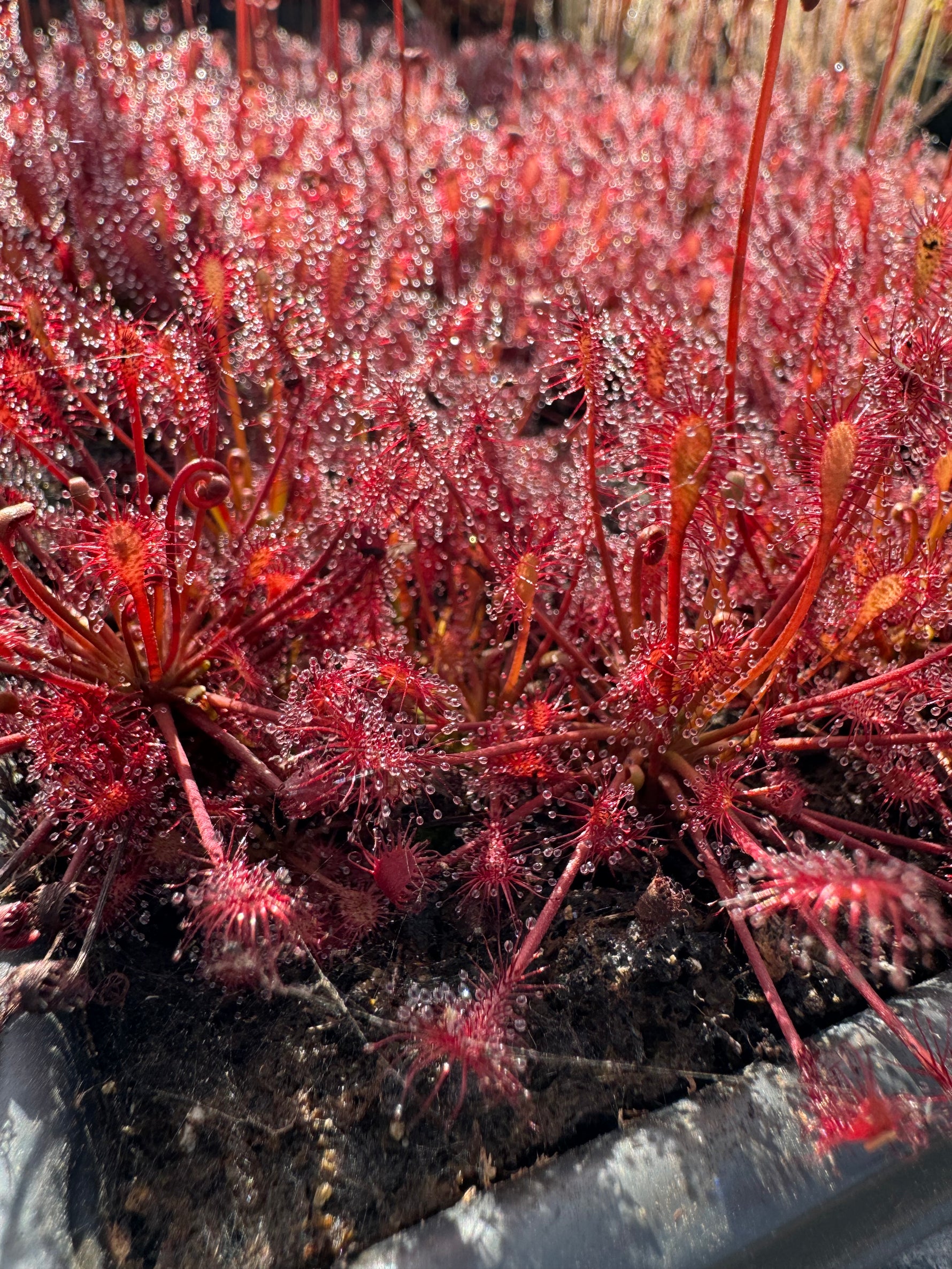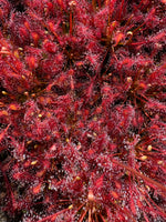 Sun: Full sun. Drosera require lots of direct sun to grow and form dew properly. In many areas, they can be grown outdoors in full sun. If you live in a very hot AND very dry place like Arizona or Sacramento, for example, you will want to grow your plants in full morning sun with protection from the afternoon sun or under 30% shade cloth. It is common for several leaves to "burn" and die back when you first place your plant into the sun; your plant is acclimating to your conditions, and in most cases, new leaves will soon grow and be fully acclimated. These small Drosera should be carefully acclimated to the full sun if introduced in the hot and sunny months of summer as smaller plants can burn too much and die. Drosera can be grown indoors on extremely sunny windowsills that receive all-day sun, or under grow lights. Grow lights should be 6-10” from the plant, depending on the light, and on a 10-12 hour day length. If your plant is not producing dew, it most likely needs more light. It can take a few weeks for a plant to regenerate this dew after shipping or making changes to its growing conditions. If grown indoors, they will want a winter dormancy. We recommend growing this species outdoors and it must receive a winter dormancy; the dormant buds often die if kept too warm!