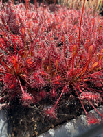 We love the stunning Drosera intermedia x capillaris! This little sundew boasts temperate parents, making it a perfect year-round outdoor plant in areas with mild winters. These delicate plants will be 2” tall and wide at maturity. Each paddle-shaped leaf is candy-apple-red and covered in glistening drops of sticky dew. They are unbelievably beautiful, especially when grown en masse.