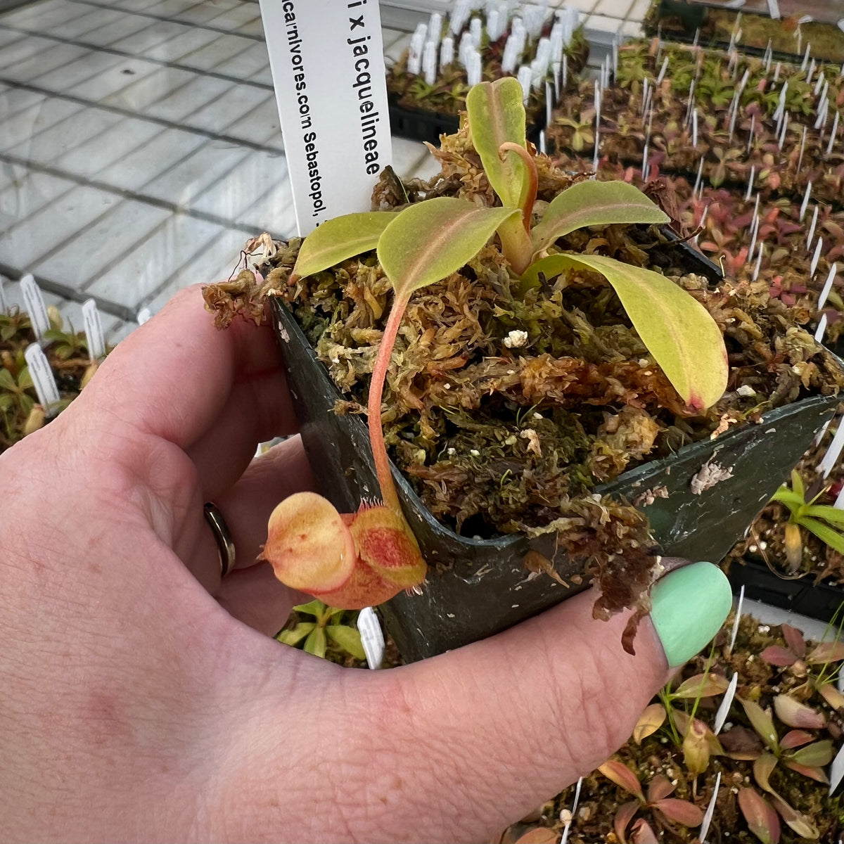 Nepenthes robcantleyi x jaquelineae is so beautiful that it feels like it couldn’t possibly be real! But luckily for all of us, it is! These pitchers have astoundingly large, wide peristomes that arch outwards, not rolling back like most peristomes, looking like the hood of a frilled lizard or a peacock with feathers outspread! If you’re going to get one jaquelineae hybrid, this is the one to get!