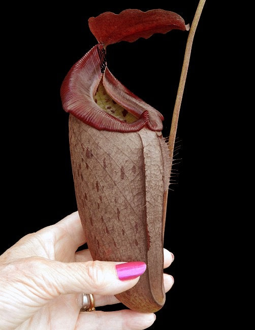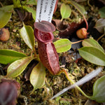 Nepenthes robcantleyi is a stunning plant with huge, flared, black peristomes and gigantic, fast-growing pitchers. Nepenthes tenuis is one of the cutest Nepenthes with a charming, tubby shape and diminutive size. This hybrid has made a super-sized tenuis with a lovely, wine-red wide peristome!