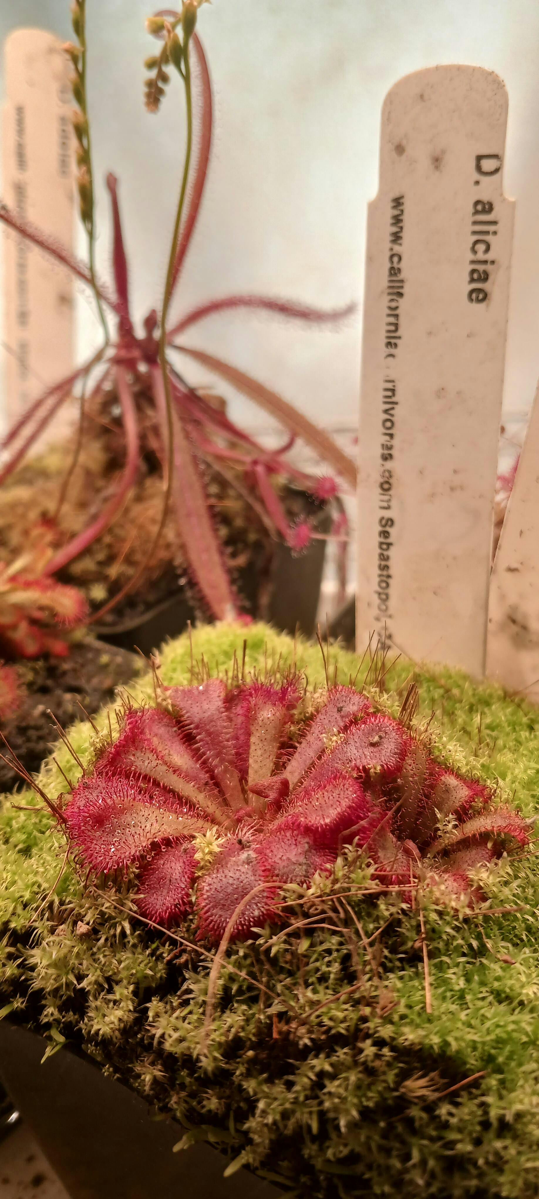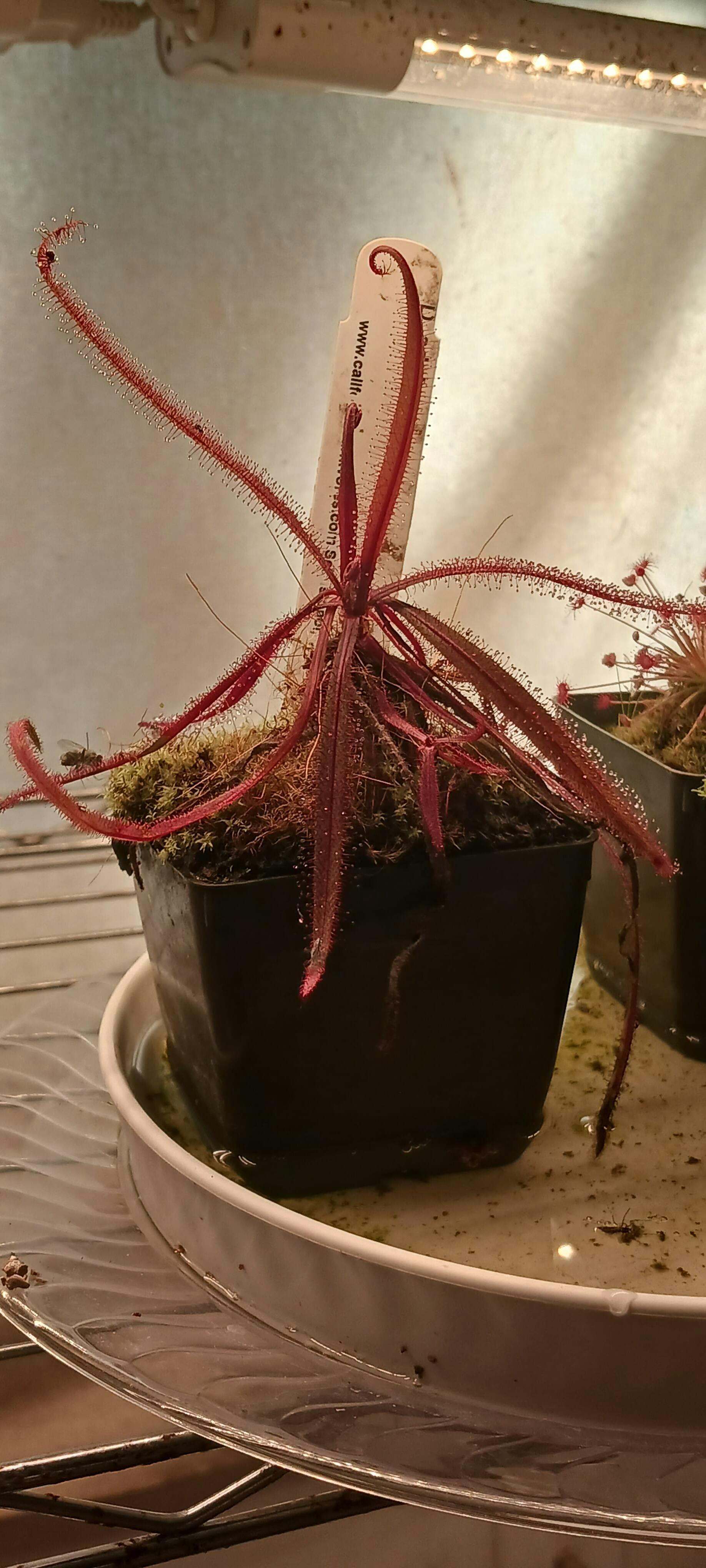 Drosera regia, the king sundew, is in a class of its own. This impressive plant is rare in nature—only a few South African colonies are known. This large plant has stiff, sword-shaped leaves arching outward in a rosette pattern. The leaves can approach two feet in length, and the plants gradually form stems that can form offshoots from their thick roots. On younger plants, the leaves can move dramatically, twisting in knots around larger prey. Indeed, it is a fantastic plant to grow. Click here for growing tips.
