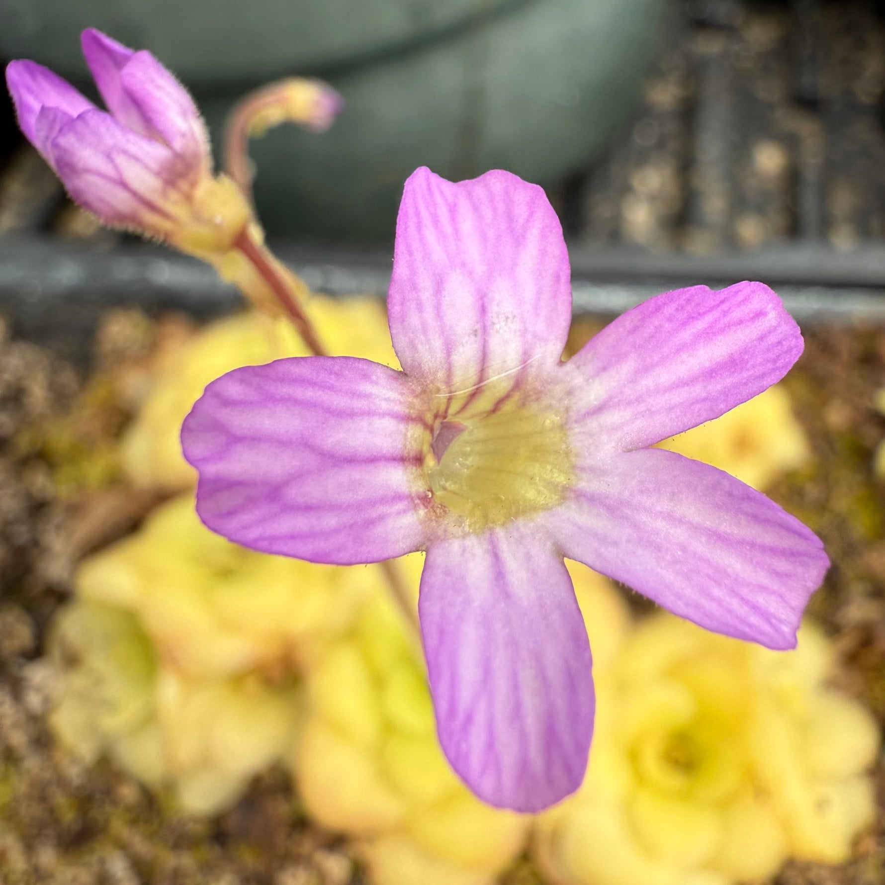 Water & Humidity: In the late spring, summer, and early autumn, Pinguicula can be kept in the tray system with overhead watering as long as they still have carnivorous foliage. This means setting the pots in a deep saucer or tray and routinely filling that with 1/4”-1/2” water. If grown in a non-draining pot, allow room to water and water overhead frequently to keep soil media moist, but do not water so deeply as to have standing water sitting on the surface of the soil; all the water should be absorbed. When the rosettes show their very first signs of growing their smaller, tighter succulent leaves immediately begin to dry out your plants. Keep the soil on the dry side, watering them only a little and let dry out in between watering. You can usually tell how dry a species enjoys its winter by the size of its succulent leaves. The tighter, smaller leafed rosettes such a Pinguicula gypsicola or the bulb-like heterophylla and macrophylla require bone-dry conditions. Species with larger winter leaves, like a few of the moranensis varieties or agnata, enjoy winters soils just slightly damp. Cuban species should be kept wet year-round, with only slight winter drying. When these plants are transitioning between carnivorous and succulent growth they are at the most risk of rotting, so it is better to air on the side of drier when the temperatures start to get colder and the photo periods shorten. In spring, as soon as the temperatures start to warm and the photo periods lengthen, start watering your plants more. When carnivorous leaves start to grow, begin the tray method again. (If your plant decides it does not want to make carnivorous leaves, don’t worry, sometimes they are stubborn! Water frequently and make sure your plant gets lots of light, preferably some natural light from the sun as well, to try to trigger carnivorous leaf growth. But don’t worry if your ping stays in succulent mode for a whole year, eventually it will grow carnivorous leaves again!) Pinguicula are extremely susceptible to dissolved minerals and salts in their water and poor water quality will directly contribute to decline of plants and death. Be sure to only use rainwater, reverse osmosis water, or distilled water. Pinguicula prefer drier conditions and do not require high humidity.