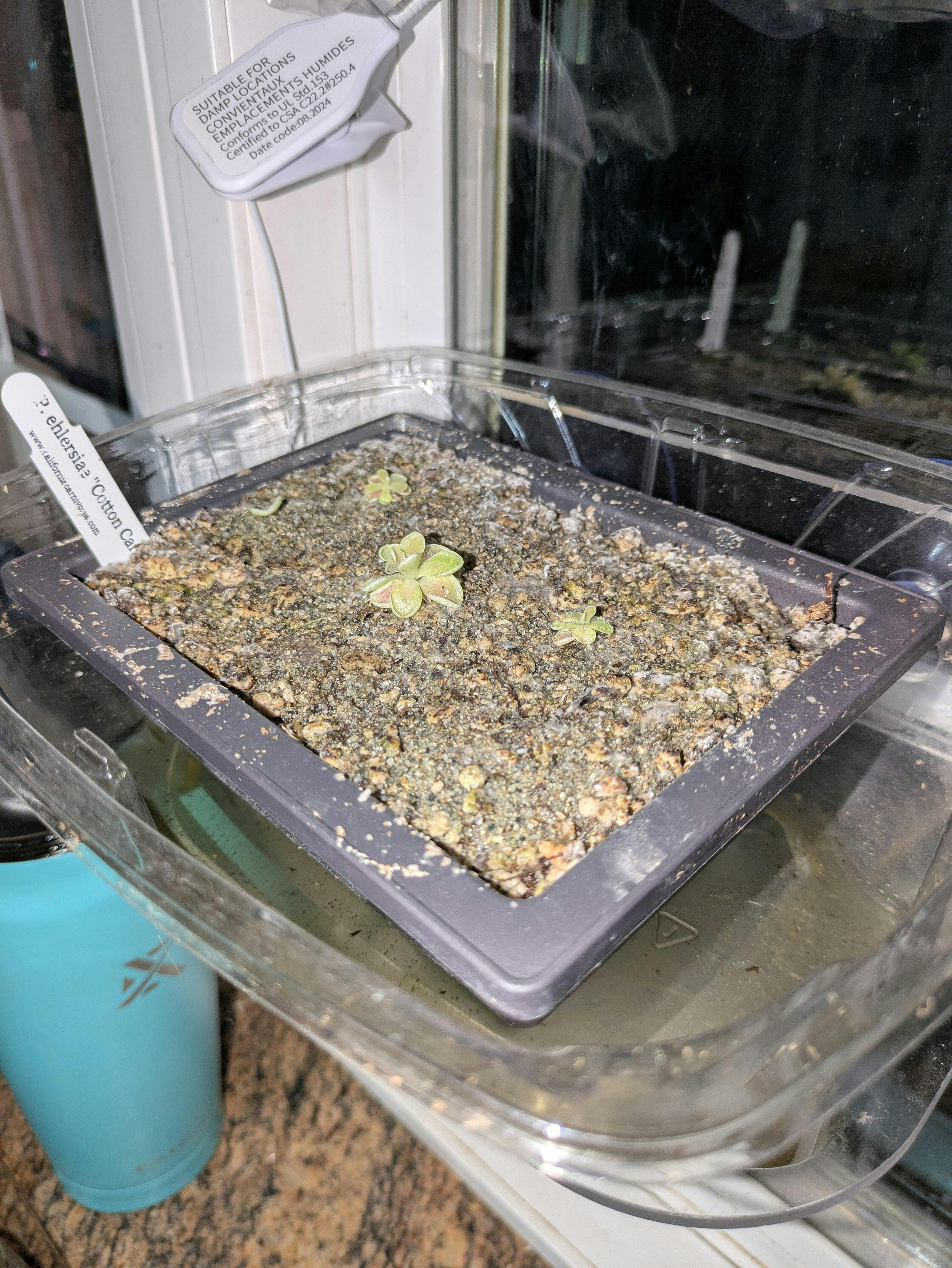Growth Habit: Pinguicula are generally small plants; depending on the species and growth phase, they can range from 1/2” to 8” across at maturity. Most are 2-4” across. They form rosettes of leaves covered in glistening dew, which have a high turnover rate, meaning that they die back frequently, and new leaves grow at the center from the plant. They have pretty leaves, some blush red or purple, and all are covered in sparkling dew. Their flowers are hummingbird and butterfly pollinated in the wild and because their pollinators are attracted to colorful flowers, they have beautiful flowers With long neck spurs! Many species will experience a winter succulent phase. A combination of shorter photo periods, cooler temperatures, and dryer conditions trigger this phase. While this phase is not necessary for the plant to thrive, it is often out of our control whether the plants do this or not. During their succulent phase, they grow small, rounded leaves that look very different from their large carnivorous leaves. Plants in this stage will be significantly smaller than they will be in carnivorous growth. The natural cycle of Pinguicula can lead them to be in succulent growth in spring, not starting their carnivorous growth until late spring sometimes even early summer. Watching them grow their carnivorous leaves is like watching a magic trick; tiny, tight leaves begin to transform into huge, sticky, carnivorous leaves! Pinguicula can easily propagate from leaf pullings, like a succulent. They will also form small clumps over time, dividing naturally. While they can have a long life, they won’t live forever, so it is a good idea to take pullings every year. They do not have significant root systems, and the roots they have are often minimal and very short. The roots can be white, transparent, or brown, and they use these roots mainly to anchor themselves to the soil's surface (they still offer benefits, though, so please do not cut them off).