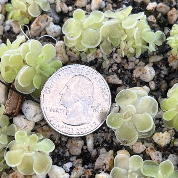 These plants are about the size of a nickel and though this species generally stays small, this cultivar can grow to 2” across.