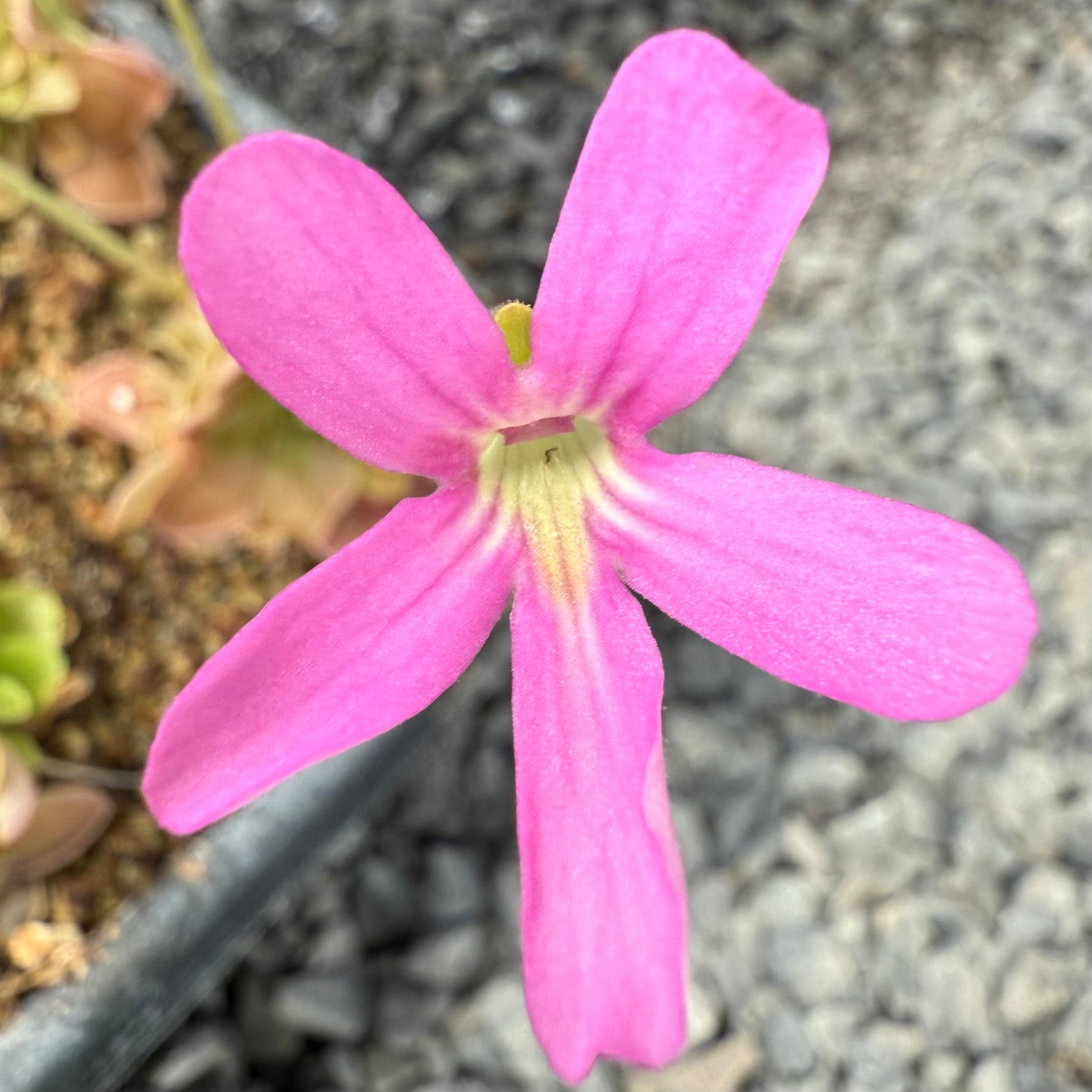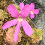 Pinguicula ehlersiae x mesophytica is a fun hybrid with beautiful pink rosettes! The flowers are unusual, with long, thin, elegant, magenta petals!