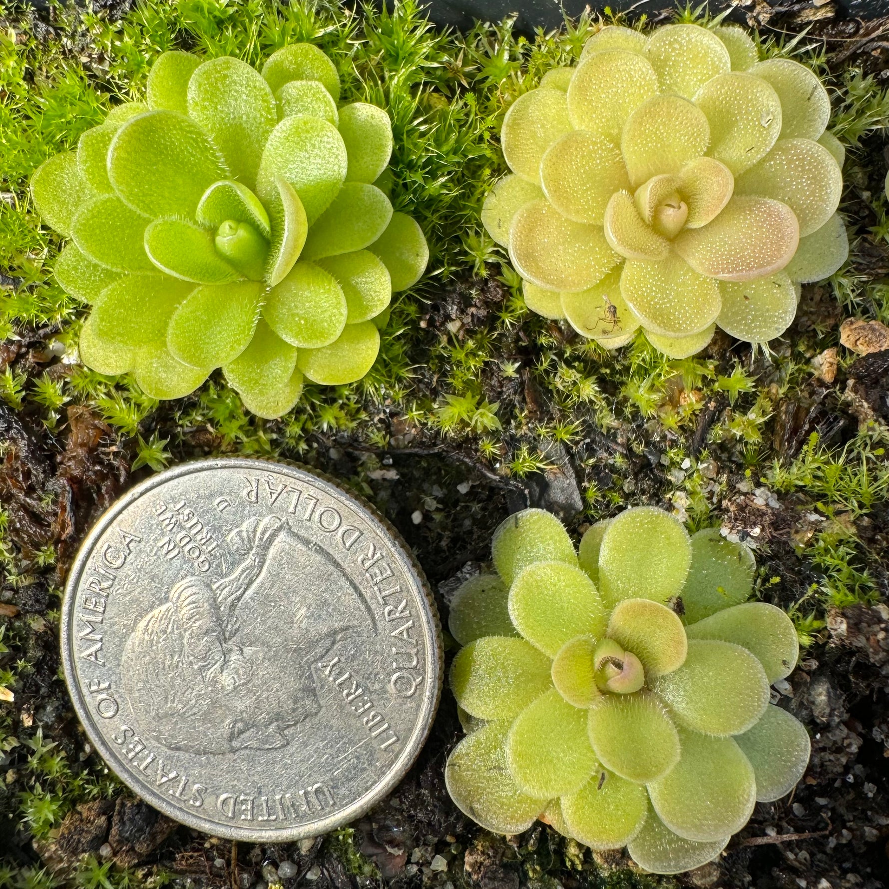 Water & Humidity: In the late spring, summer, and early autumn, Pinguicula can be kept in the tray system with overhead watering as long as they still have carnivorous foliage. This means setting the pots in a deep saucer or tray and routinely filling that with 1/4”-1/2” water. If grown in a non-draining pot, allow room to water and water overhead frequently to keep soil media moist but do not water so deeply as to have standing water sitting on the surface of the soil, all the water should be absorbed. When the rosettes show their very first signs of growing their smaller, tighter succulent leaves immediately begin to dry out your plants. Keep the soil on the dry side, watering them only a little and let dry out in between watering. You can usually tell how dry a species enjoys its winter by the size of its succulent leaves. The tighter, smaller leafed rosettes such a Pinguicula gypsicola or the bulb-like heterophylla and macrophylla require bone-dry conditions. Species with larger winter leaves, like a few of the moranensis varieties or agnata, enjoy winters soils just slightly damp. Cuban species should be kept wet year-round, with only slight winter drying. When these plants are transitioning between carnivorous and succulent growth they are at the most risk of rotting, so it is better to air on the side of drier when the temperatures start to get colder and the photo periods shorten. In spring, as soon as the temperatures start to warm and the photo periods lengthen, start watering your plants more. When carnivorous leaves start to grow, begin the tray method again. (If your plant decides it does not want to make carnivorous leaves, don’t worry, sometimes they are stubborn! Water frequently and make sure your plant gets lots of light, preferably some natural light from the sun as well, to try to trigger carnivorous leaf growth. But don’t worry if your ping stays in succulent mode for a whole year, eventually it will grow carnivorous leaves again!) Pinguicula are extremely susceptible to dissolved minerals and salts in their water and poor water quality will directly contribute to decline of plants and death. Be sure to only use rainwater, reverse osmosis water, or distilled water. Pinguicula prefer drier conditions and do not require high humidity.