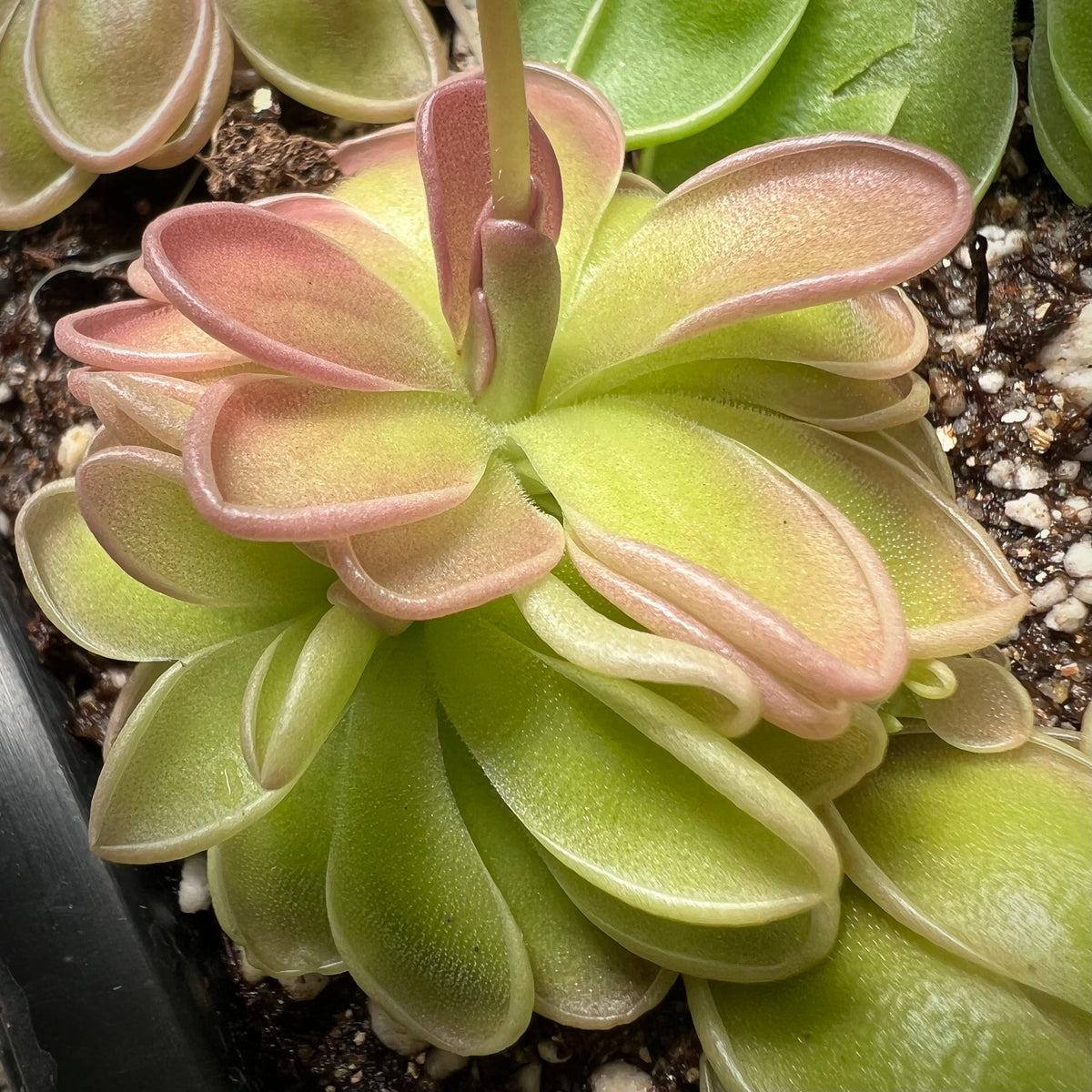 Growth Habit: Pinguicula are generally small plants; depending on the species and growth phase, they can range from 1/2” to 8” across at maturity. Most are 2-4” across. They form rosettes of leaves covered in glistening dew, which have a high turnover rate, meaning that they die back frequently, and new leaves grow at the center from the plant. They have pretty leaves, some blush red or purple, and all are covered in sparkling dew. Their flowers are hummingbird and butterfly pollinated in the wild and because their pollinators are attracted to colorful flowers, they have beautiful flowers With long neck spurs! Many species will experience a winter succulent phase. A combination of shorter photo periods, cooler temperatures, and dryer conditions trigger this phase. While this phase is not necessary for the plant to thrive, it is often out of our control whether the plants do this or not. During their succulent phase, they grow small, rounded leaves that look very different from their large carnivorous leaves. Plants in this stage will be significantly smaller than they will be in carnivorous growth. The natural cycle of Pinguicula can lead them to be in succulent growth in spring, not starting their carnivorous growth until late spring sometimes even early summer. Watching them grow their carnivorous leaves is like watching a magic trick; tiny, tight leaves begin to transform into huge, sticky, carnivorous leaves! Pinguicula can easily propagate from leaf pullings, like a succulent. They will also form small clumps over time, dividing naturally. While they can have a long life, they won’t live forever, so it is a good idea to take pullings every year. They do not have significant root systems, and the roots they have are often minimal and very short. The roots can be white, transparent, or brown, and they use these roots mainly to anchor themselves to the soil's surface (they still offer benefits, though, so please do not cut them off).