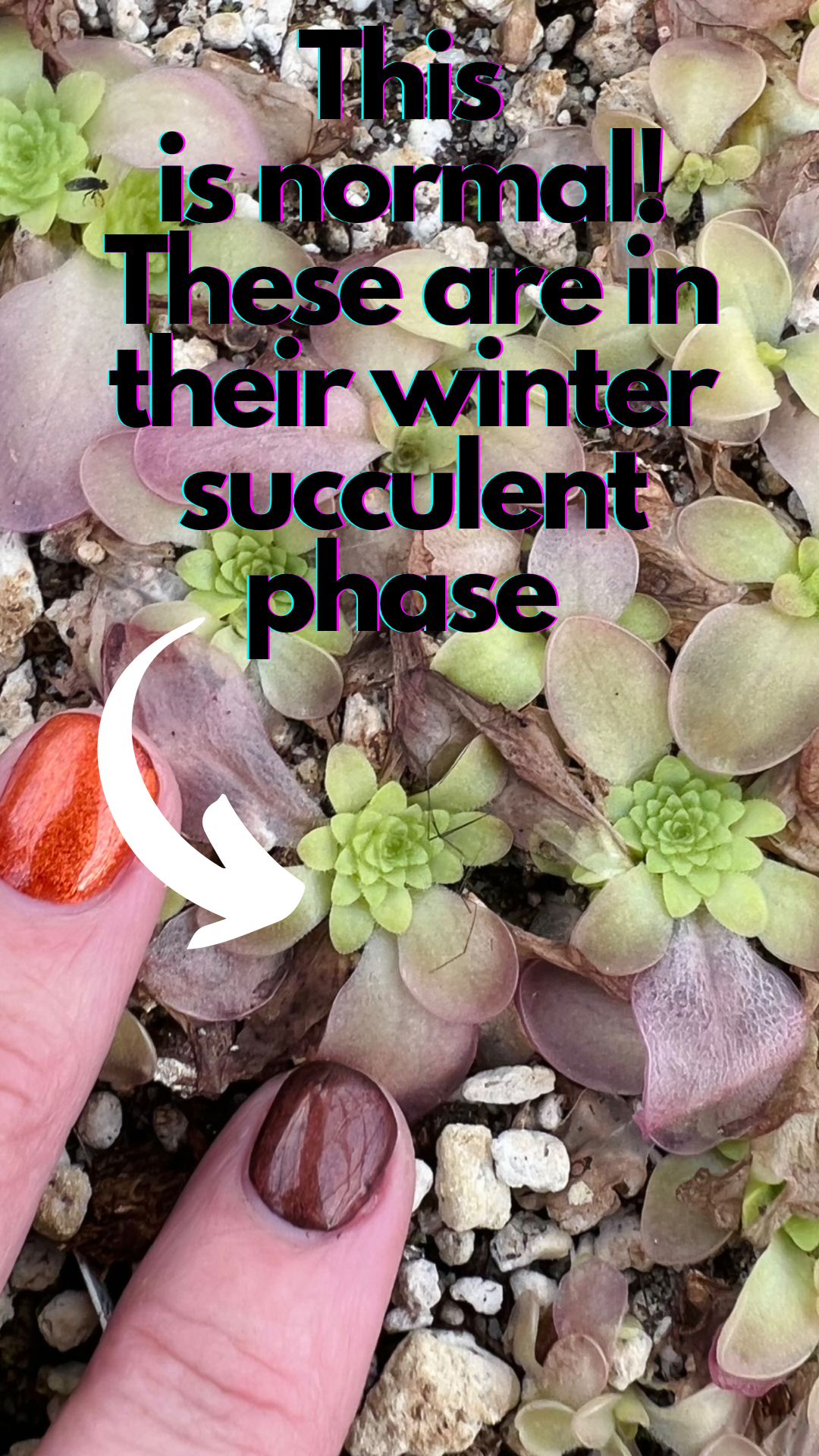 IF YOU ORDER IN WINTER/EARLY SPRING YOUR PLANT MAY ARRIVE IN WINTER SUCCULENT MODE. DURING THIS TIME, IT WILL GROW SUBSTANTIALLY SMALLER, TIGHT, SUCCULENT LEAVES. DO NOT OVER WATER DURING THIS TIME. IT WILL GROW CARNIVOROUS LEAVES IN THE SPRING.