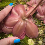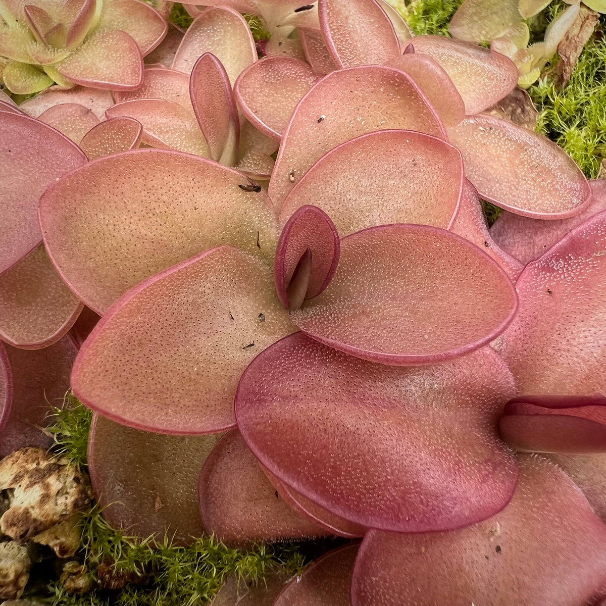 Growth Habit: Pinguicula are generally small plants; depending on the species and growth phase, they can range from 1/2” to 8” across at maturity. Most are 2-4” across. They form rosettes of leaves covered in glistening dew, which have a high turnover rate, meaning that they die back frequently, and new leaves grow at the center from the plant. They have pretty leaves, some blush red or purple, and all are covered in sparkling dew. Their flowers are hummingbird and butterfly pollinated in the wild and because their pollinators are attracted to colorful flowers, they have beautiful flowers With long neck spurs! Many species will experience a winter succulent phase. A combination of shorter photo periods, cooler temperatures, and dryer conditions trigger this phase. While this phase is not necessary for the plant to thrive, it is often out of our control whether the plants do this or not. During their succulent phase, they grow small, rounded leaves that look very different from their large carnivorous leaves. Plants in this stage will be significantly smaller than they will be in carnivorous growth. The natural cycle of Pinguicula can lead them to be in succulent growth in spring, not starting their carnivorous growth until late spring sometimes even early summer. Watching them grow their carnivorous leaves is like watching a magic trick; tiny, tight leaves begin to transform into huge, sticky, carnivorous leaves! Pinguicula can easily propagate from leaf pullings, like a succulent. They will also form small clumps over time, dividing naturally. While they can have a long life, they won’t live forever, so it is a good idea to take pullings every year. They do not have significant root systems, and the roots they have are often minimal and very short. The roots can be white, transparent, or brown, and they use these roots mainly to anchor themselves to the soil's surface (they still offer benefits, though, so please do not cut them off).