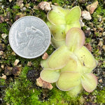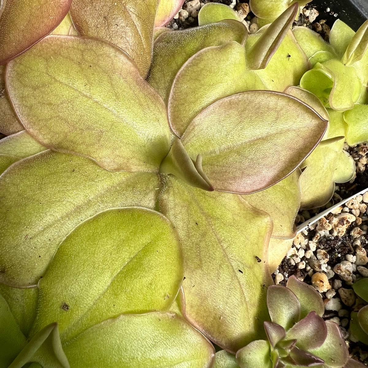 Growth Habit: Pinguicula are generally small plants; depending on the species and growth phase, they can range from 1/2” to 8” across at maturity. Most are 2-4” across. They form rosettes of leaves covered in glistening dew, which have a high turnover rate, meaning that they die back frequently, and new leaves grow at the center from the plant. They have pretty leaves, some blush red or purple, and all are covered in sparkling dew. Their flowers are hummingbird and butterfly pollinated in the wild and because their pollinators are attracted to colorful flowers, they have beautiful flowers With long neck spurs! Many species will experience a winter succulent phase. A combination of shorter photo periods, cooler temperatures, and dryer conditions trigger this phase. While this phase is not necessary for the plant to thrive, it is often out of our control whether the plants do this or not. During their succulent phase, they grow small, rounded leaves that look very different from their large carnivorous leaves. Plants in this stage will be significantly smaller than they will be in carnivorous growth. The natural cycle of Pinguicula can lead them to be in succulent growth in spring, not starting their carnivorous growth until late spring sometimes even early summer. Watching them grow their carnivorous leaves is like watching a magic trick; tiny, tight leaves begin to transform into huge, sticky, carnivorous leaves! Pinguicula can easily propagate from leaf pullings, like a succulent. They will also form small clumps over time, dividing naturally. While they can have a long life, they won’t live forever, so it is a good idea to take pullings every year. They do not have significant root systems, and the roots they have are often minimal and very short. The roots can be white, transparent, or brown, and they use these roots mainly to anchor themselves to the soil's surface (they still offer benefits, though, so please do not cut them off).
