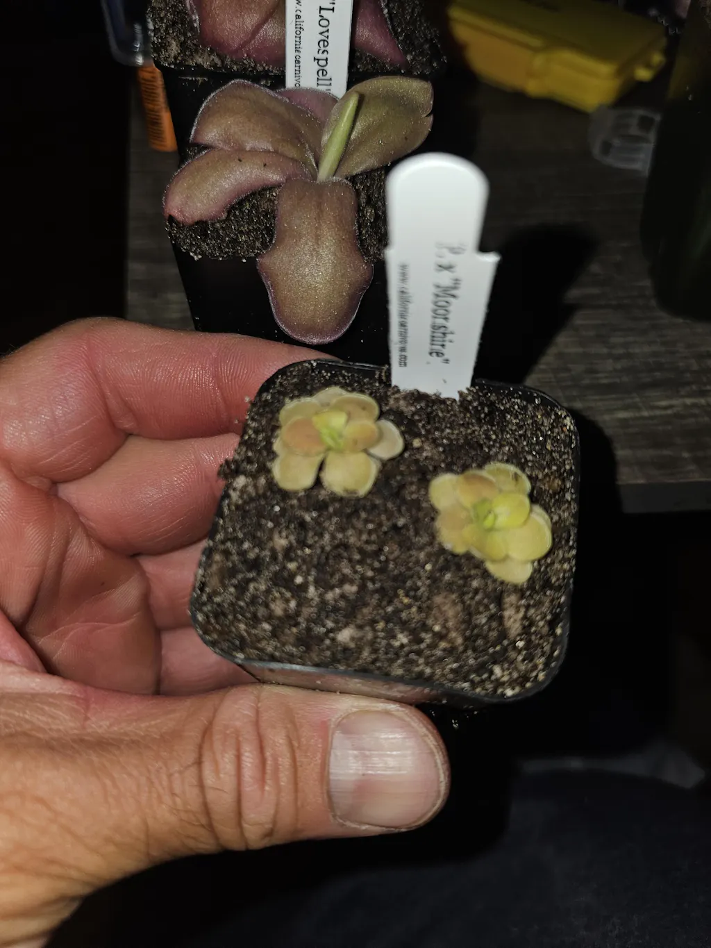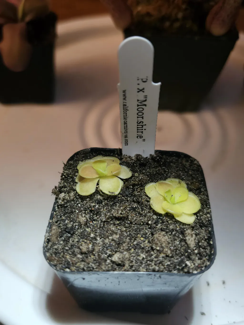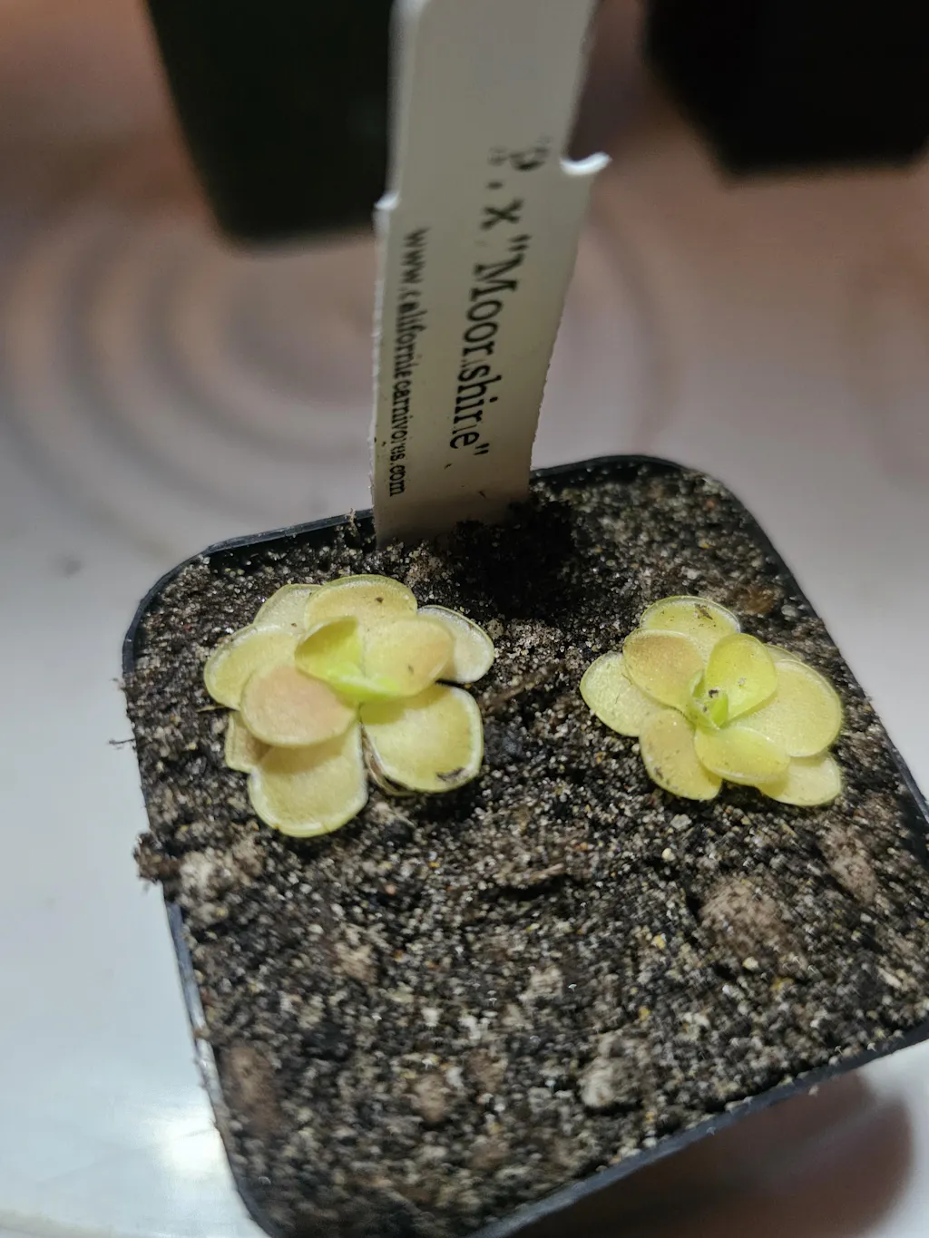 Water & Humidity: In the late spring, summer, and early autumn, Pinguicula can be kept in the tray system with overhead watering as long as they still have carnivorous foliage. This means setting the pots in a deep saucer or tray and routinely filling that with 1/4”-1/2” water. If grown in a non-draining pot, allow room to water and water overhead frequently to keep soil media moist, but do not water so deeply as to have standing water sitting on the surface of the soil; all the water should be absorbed. When the rosettes show their very first signs of growing their smaller, tighter succulent leaves immediately begin to dry out your plants. Keep the soil on the dry side, watering them only a little and let dry out in between watering. You can usually tell how dry a species enjoys its winter by the size of its succulent leaves. The tighter, smaller leafed rosettes such a Pinguicula gypsicola or the bulb-like heterophylla and macrophylla require bone-dry conditions. Species with larger winter leaves, like a few of the moranensis varieties or agnata, enjoy winters soils just slightly damp.  Cuban species should be kept wet year-round, with only slight winter drying. When these plants are transitioning between carnivorous and succulent growth they are at the most risk of rotting, so it is better to air on the side of drier when the temperatures start to get colder and the photo periods shorten. In spring, as soon as the temperatures start to warm and the photo periods lengthen, start watering your plants more. When carnivorous leaves start to grow, begin the tray method again. (If your plant decides it does not want to make carnivorous leaves, don’t worry, sometimes they are stubborn! Water frequently and make sure your plant gets lots of light, preferably some natural light from the sun as well, to try to trigger carnivorous leaf growth. But don’t worry if your ping stays in succulent mode for a whole year, eventually it will grow carnivorous leaves again!) Pinguicula are extremely susceptible to dissolved minerals and salts in their water and poor water quality will directly contribute to decline of plants and death. Be sure to only use rainwater, reverse osmosis water, or distilled water.