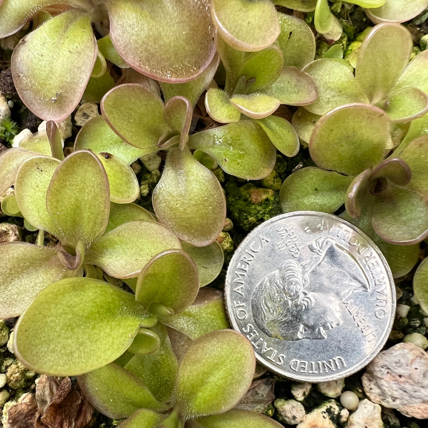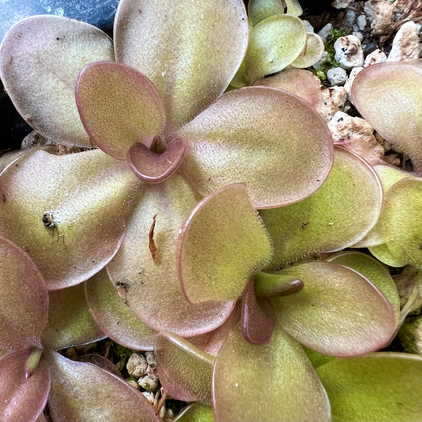 Growth Habit: Pinguicula are generally small plants; depending on the species and growth phase, they can range from 1/2” to 8” across at maturity. Most are 2-4” across. They form rosettes of leaves covered in glistening dew, which have a high turnover rate, meaning that they die back frequently, and new leaves grow at the center from the plant. They have pretty leaves, some blush red or purple, and all are covered in sparkling dew. Their flowers are hummingbird and butterfly pollinated in the wild and because their pollinators are attracted to colorful flowers, they have beautiful flowers With long neck spurs! Many species will experience a winter succulent phase. A combination of shorter photo periods, cooler temperatures, and dryer conditions trigger this phase. While this phase is not necessary for the plant to thrive, it is often out of our control whether the plants do this or not. During their succulent phase, they grow small, rounded leaves that look very different from their large carnivorous leaves. Plants in this stage will be significantly smaller than they will be in carnivorous growth. The natural cycle of Pinguicula can lead them to be in succulent growth in spring, not starting their carnivorous growth until late spring sometimes even early summer. Watching them grow their carnivorous leaves is like watching a magic trick; tiny, tight leaves begin to transform into huge, sticky, carnivorous leaves! Pinguicula can easily propagate from leaf pullings, like a succulent. They will also form small clumps over time, dividing naturally. While they can have a long life, they won’t live forever, so it is a good idea to take pullings every year. They do not have significant root systems, and the roots they have are often minimal and very short. The roots can be white, transparent, or brown, and they use these roots mainly to anchor themselves to the soil's surface (they still offer benefits, though, so please do not cut them off).
