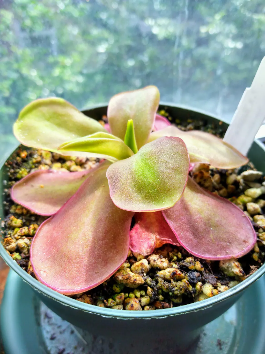 Water & Humidity: In the late spring, summer, and early autumn, Pinguicula can be kept in the tray system with overhead watering as long as they still have carnivorous foliage. This means setting the pots in a deep saucer or tray and routinely filling that with 1/4”-1/2” water. If grown in a non-draining pot, allow room to water and water overhead frequently to keep soil media moist, but do not water so deeply as to have standing water sitting on the surface of the soil; all the water should be absorbed. When the rosettes show their very first signs of growing their smaller, tighter succulent leaves immediately begin to dry out your plants. Keep the soil on the dry side, watering them only a little and let dry out in between watering. You can usually tell how dry a species enjoys its winter by the size of its succulent leaves. The tighter, smaller leafed rosettes such a Pinguicula gypsicola or the bulb-like heterophylla and macrophylla require bone-dry conditions. Species with larger winter leaves, like a few of the moranensis varieties or agnata, enjoy winters soils just slightly damp. Cuban species should be kept wet year-round, with only slight winter drying. When these plants are transitioning between carnivorous and succulent growth they are at the most risk of rotting, so it is better to air on the side of drier when the temperatures start to get colder and the photo periods shorten. In spring, as soon as the temperatures start to warm and the photo periods lengthen, start watering your plants more. When carnivorous leaves start to grow, begin the tray method again. (If your plant decides it does not want to make carnivorous leaves, don’t worry, sometimes they are stubborn! Water frequently and make sure your plant gets lots of light, preferably some natural light from the sun as well, to try to trigger carnivorous leaf growth. But don’t worry if your ping stays in succulent mode for a whole year, eventually it will grow carnivorous leaves again!) Pinguicula are extremely susceptible to dissolved minerals and salts in their water and poor water quality will directly contribute to decline of plants and death. Be sure to only use rainwater, reverse osmosis water, or distilled water. Pinguicula prefer drier conditions and do not require high humidity.