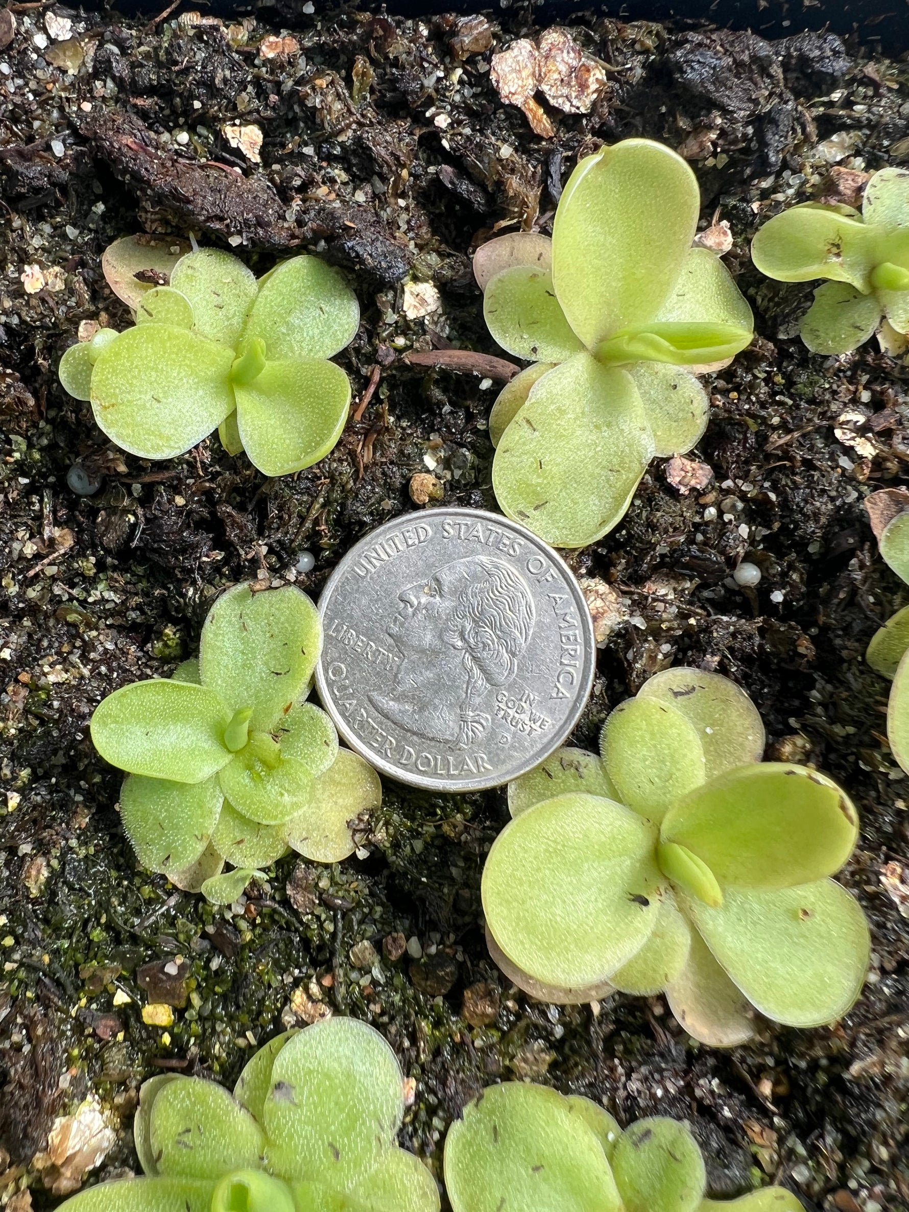 Growth Habit: Pinguicula are generally small plants; depending on the species and growth phase, they can range from 1/2” to 8” across at maturity. Most are 2-4” across. They form rosettes of leaves covered in glistening dew, which have a high turnover rate, meaning that they die back frequently, and new leaves grow at the center from the plant. They have pretty leaves, some blush red or purple, and all are covered in sparkling dew. Their flowers are hummingbird and butterfly pollinated in the wild and because their pollinators are attracted to colorful flowers, they have beautiful flowers With long neck spurs! Many species will experience a winter succulent phase. A combination of shorter photo periods, cooler temperatures, and dryer conditions trigger this phase. While this phase is not necessary for the plant to thrive, it is often out of our control whether the plants do this or not. During their succulent phase, they grow small, rounded leaves that look very different from their large carnivorous leaves. Plants in this stage will be significantly smaller than they will be in carnivorous growth. The natural cycle of Pinguicula can lead them to be in succulent growth in spring, not starting their carnivorous growth until late spring, sometimes even early summer. Watching them grow their carnivorous leaves is like watching a magic trick; tiny, tight leaves begin to transform into huge, sticky, carnivorous leaves! Pinguicula can easily propagate from leaf pullings, like a succulent. They will also form small clumps over time, dividing naturally. While they can have a long life, they won’t live forever, so it is a good idea to take pullings every year. They do not have significant root systems, and the roots they have are often minimal and very short. The roots can be white, transparent, or brown, and they use these roots mainly to anchor themselves to the soil's surface (they still offer benefits, though, so please do not cut them off).