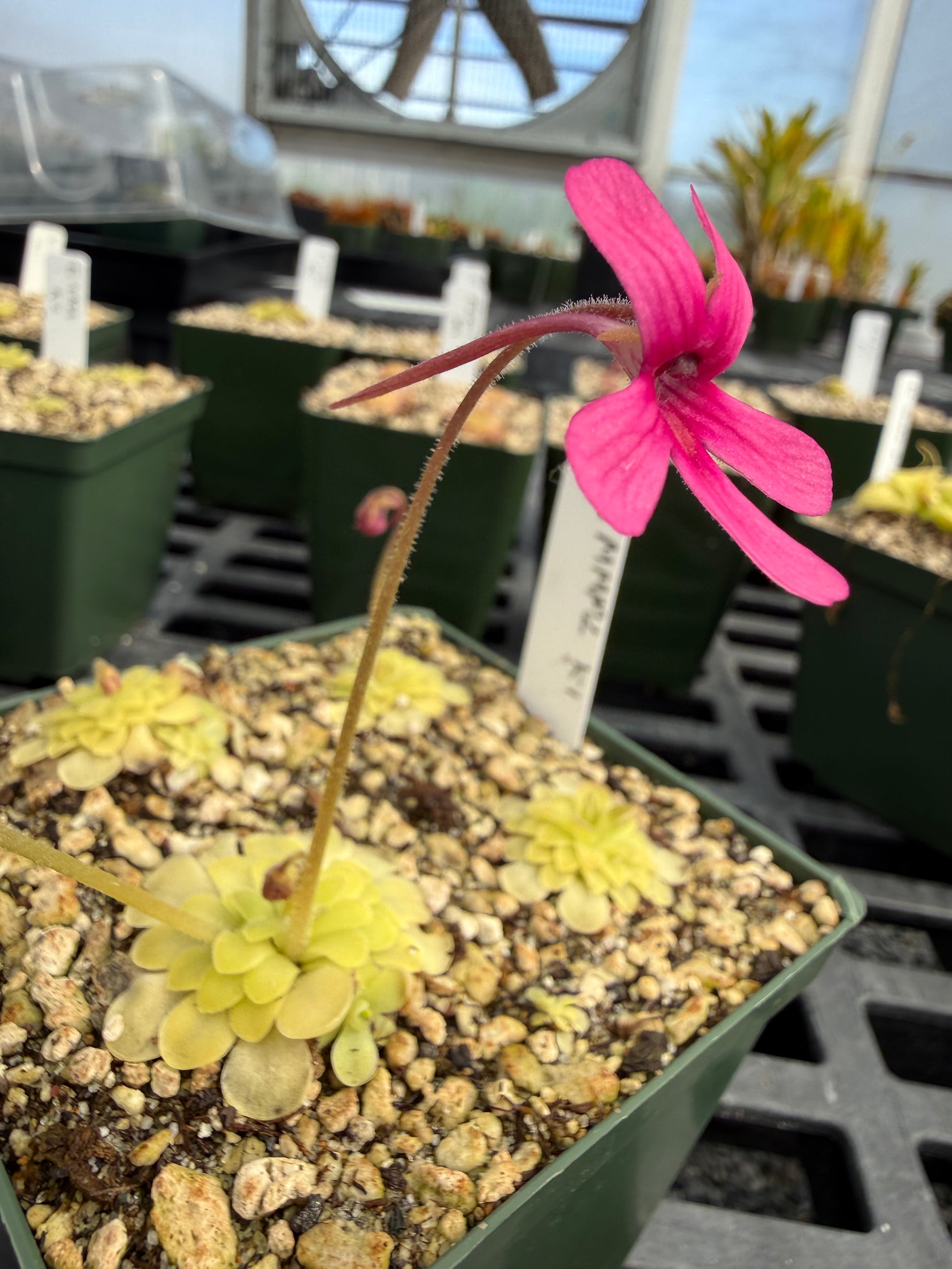 Water & Humidity: In the late spring, summer, and early autumn, Pinguicula can be kept in the tray system with overhead watering as long as they still have carnivorous foliage. This means setting the pots in a deep saucer or tray and routinely filling that with 1/4”-1/2” water. If grown in a non-draining pot, allow room to water and water overhead frequently to keep soil media moist, but do not water so deeply as to have standing water sitting on the surface of the soil; all the water should be absorbed. When the rosettes show their very first signs of growing their smaller, tighter succulent leaves immediately begin to dry out your plants. Keep the soil on the dry side, watering them only a little and let dry out in between watering. You can usually tell how dry a species enjoys its winter by the size of its succulent leaves. The tighter, smaller leafed rosettes such a Pinguicula gypsicola or the bulb-like heterophylla and macrophylla require bone-dry conditions. Species with larger winter leaves, like a few of the moranensis varieties or agnata, enjoy winters soils just slightly damp. Cuban species should be kept wet year-round, with only slight winter drying. When these plants are transitioning between carnivorous and succulent growth they are at the most risk of rotting, so it is better to air on the side of drier when the temperatures start to get colder and the photo periods shorten. In spring, as soon as the temperatures start to warm and the photo periods lengthen, start watering your plants more. When carnivorous leaves start to grow, begin the tray method again. (If your plant decides it does not want to make carnivorous leaves, don’t worry, sometimes they are stubborn! Water frequently and make sure your plant gets lots of light, preferably some natural light from the sun as well, to try to trigger carnivorous leaf growth. But don’t worry if your ping stays in succulent mode for a whole year, eventually it will grow carnivorous leaves again!) Pinguicula are extremely susceptible to dissolved minerals and salts in their water and poor water quality will directly contribute to decline of plants and death. Be sure to only use rainwater, reverse osmosis water, or distilled water. Pinguicula prefer drier conditions and do not require high humidity.