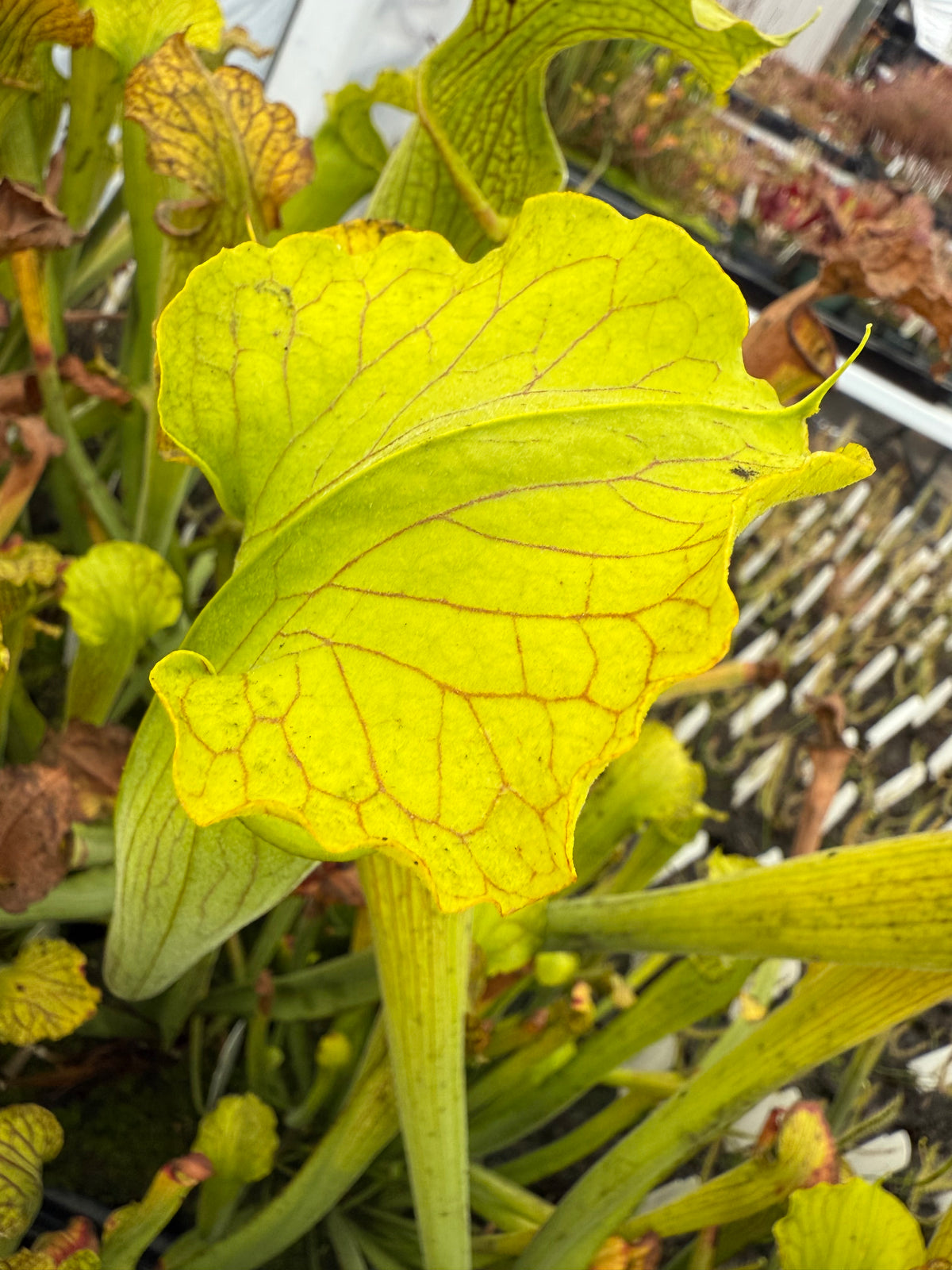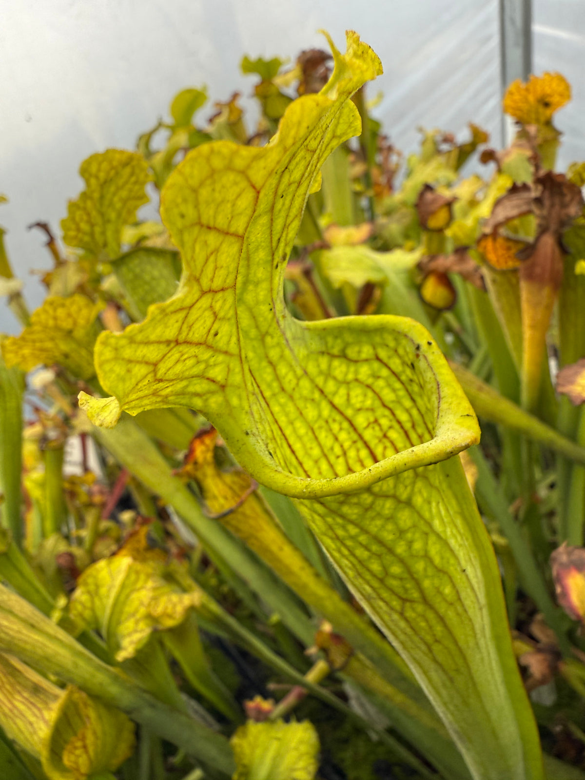 Sarracenia ( x ‘Leah Wilkerson’ ) x alata anthocyanin-free is a very cool, seed-grown cross of two tall, ruffly, beautifully white and green colored plants! They will all be quite tall, with a green color, some highlighted with red blotched throats, green or white venation, and some entirely neon-green.