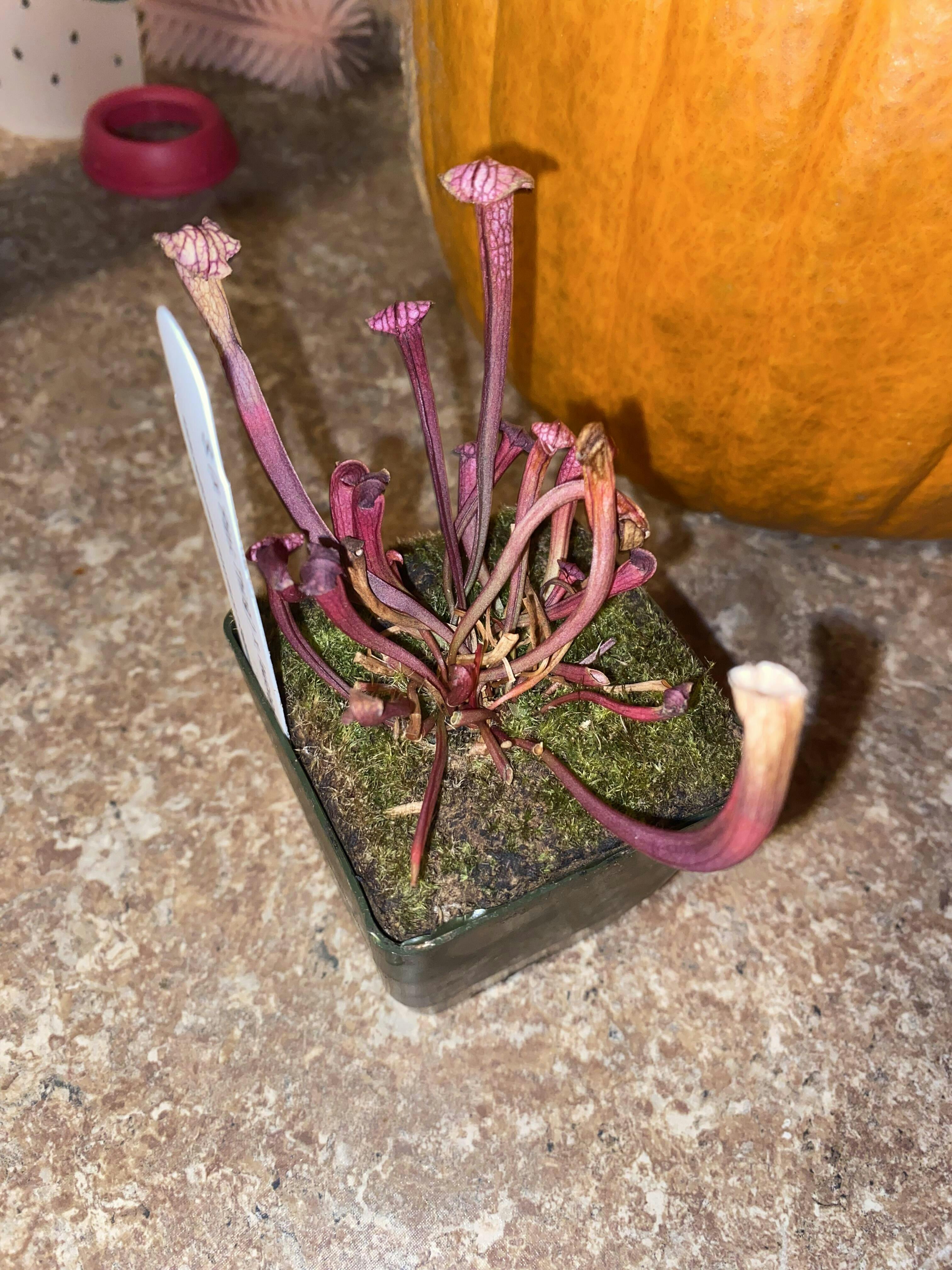 Water: Always keep them in a saucer with a few inches of distilled, rainwater, or reverse osmosis water. Never let them dry out, especially in the hot summer months. Sarracenia are bog plants that prefer water-logged conditions unless you live somewhere both very hot AND extremely humid, like Alabama. In that case, let the water tray dry out for a day or two between refills. Always use distilled, reverse osmosis, or rainwater only. These plants are sensitive to their water quality, and giving them mineral and salt-free water is very important. In winter, when the plants are dormant, you can let them dry out a bit between rain storms, but do not let the soil get so dry that it pulls away from the edges of the pots. Be sure to supplement water as needed in between rains in winter.