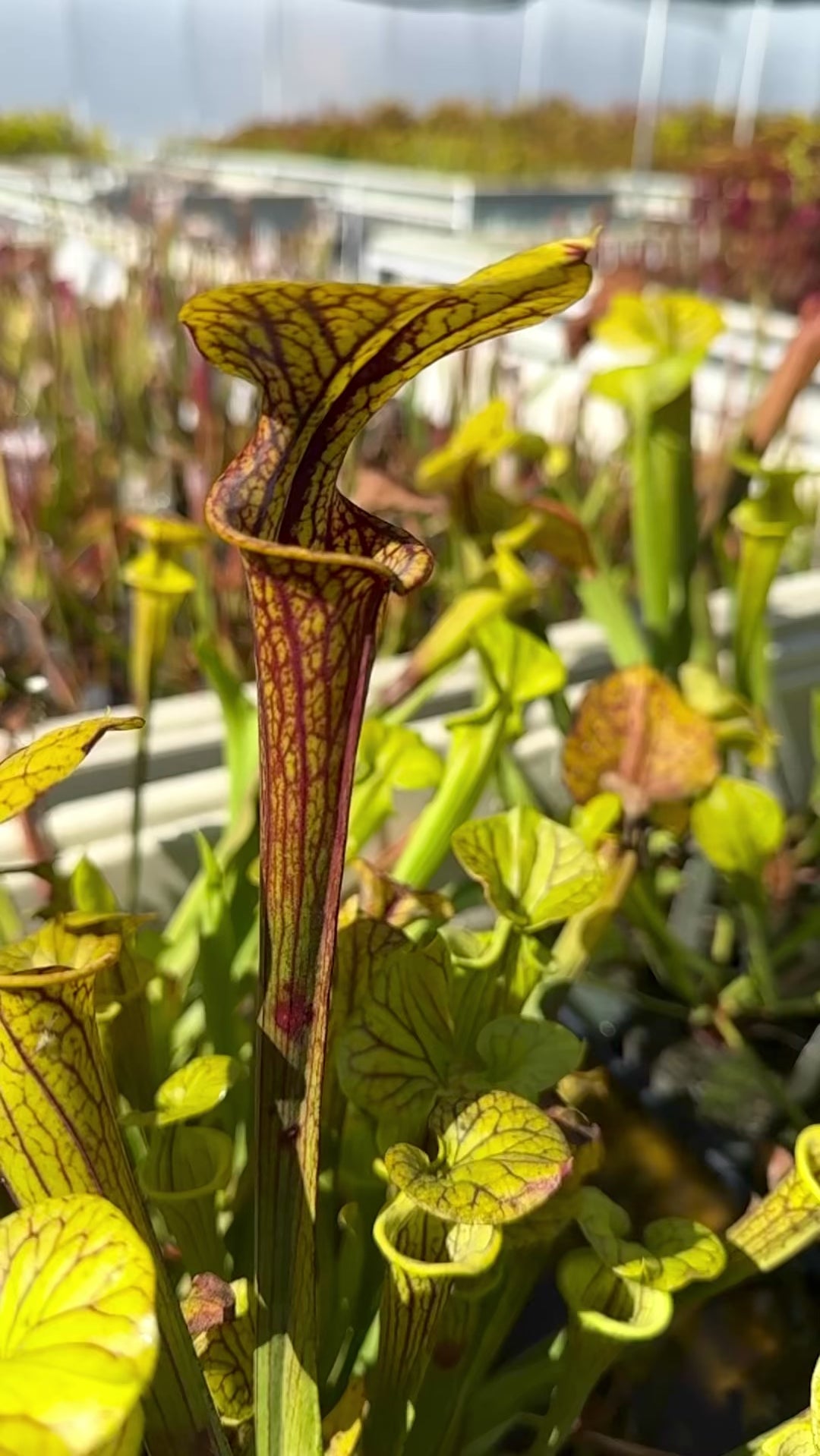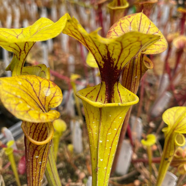 Some of the most beautiful flava in cultivation are the ornata variety. They have electric yellow pitchers with dark red pinstripes. They emerge in spring with brightly colored pitchers and red venation, and the color deepens over the summer with the venation turning blood-red, almost black, over time! The pitchers are tall with round, oversized lids.