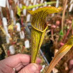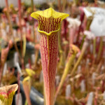 Sarracenia alata, the Pale Trumpet, has unique, superbly pale yellow, almost pure white flowers. It has very upright pitchers that are quite variable in both size and coloration. Sarracenia alata has neatly pointed lids, usually held closely to the mouth with a slightly bulging throat.