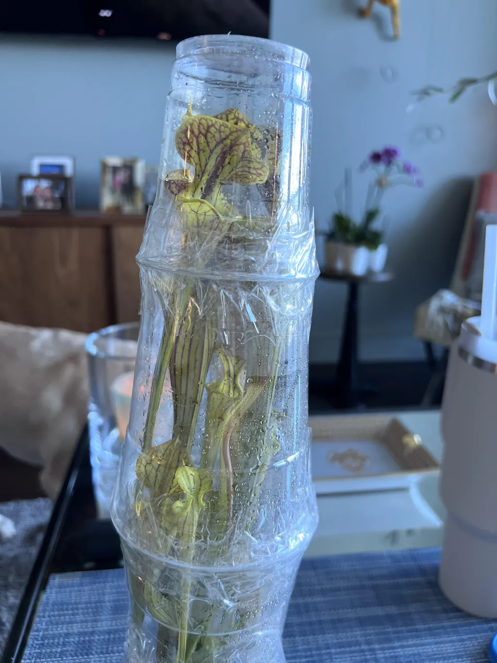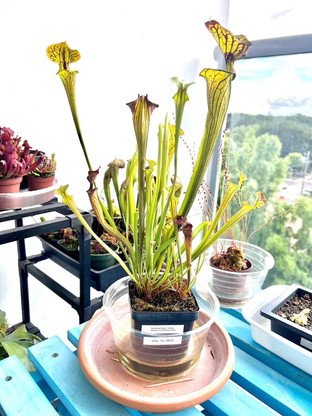 Water: Always keep them in a saucer with a few inches of distilled, rainwater, or reverse osmosis water. Never let them dry out, especially in the hot summer months. Sarracenia are bog plants that prefer water-logged conditions unless you live somewhere both very hot AND extremely humid, like Alabama. In that case, let the water tray dry out for a day or two between refills. Always use distilled, reverse osmosis, or rainwater only. These plants are sensitive to their water quality, and giving them mineral and salt-free water is very important. In winter, when the plants are dormant, you can let them dry out a bit between rain storms, but do not let the soil get so dry that it pulls away from the edges of the pots. Be sure to supplement water as needed in between rains in winter.