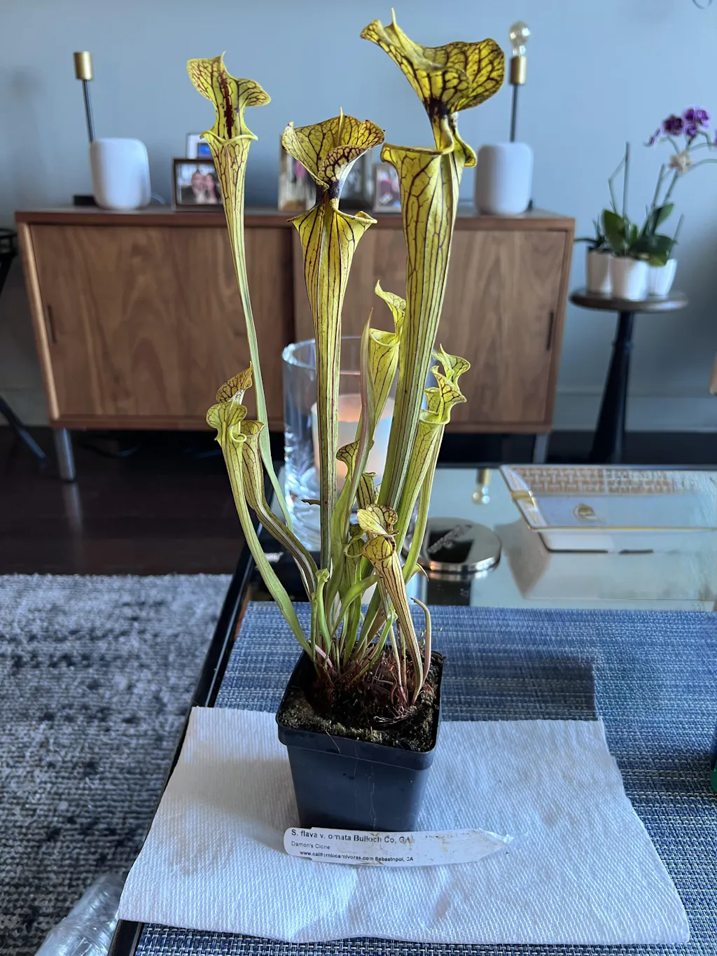 Sarracenia flava var ornata “Bulloch Co Damon’s Clone” is an unbelievably gorgeous flava! The flava ornatas from Bulloch County are now famous for their wide mouths and beautiful, pin-striped veins. They are a short form of flava, usually staying about a foot tall, even at maturity. The site where these seeds were initially collected no longer exists in the wild. Damon selected this seedling when it was two inches tall, and it has proven to be one of the very best. This fantastic flava has chartreuse pitchers articulated with dark, intricate venation and wide, deeply notched mouths. Huge, flaring lids are webbed in delicate, contrasting venation!