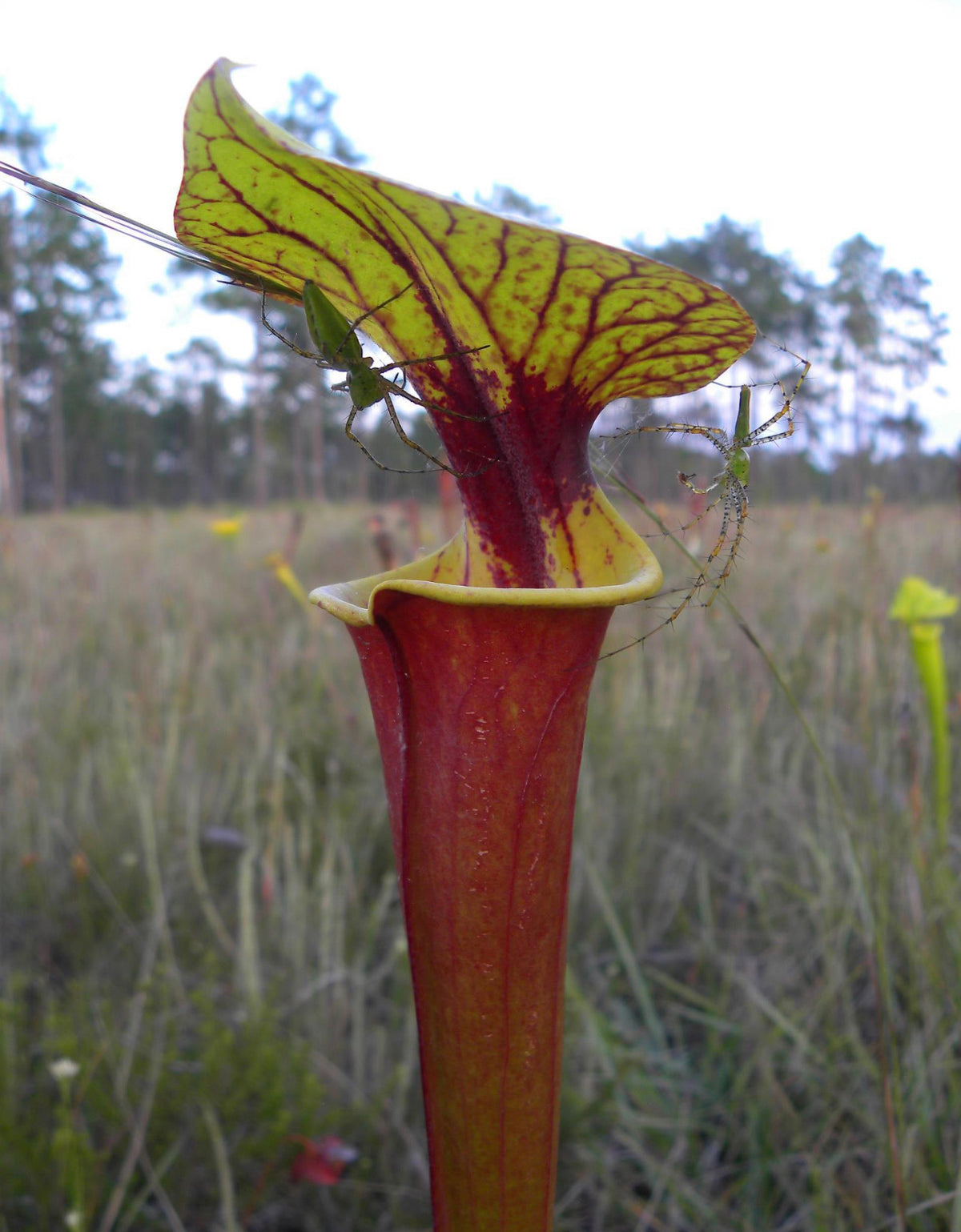 Stunningly beautiful and eye catching in a bog garden; this is one of the best color varieties of Sarracenia flava! The entire pitcher body is dark red with a dark red throat, the top of the lid and the lip remain green for a beautiful contrast.