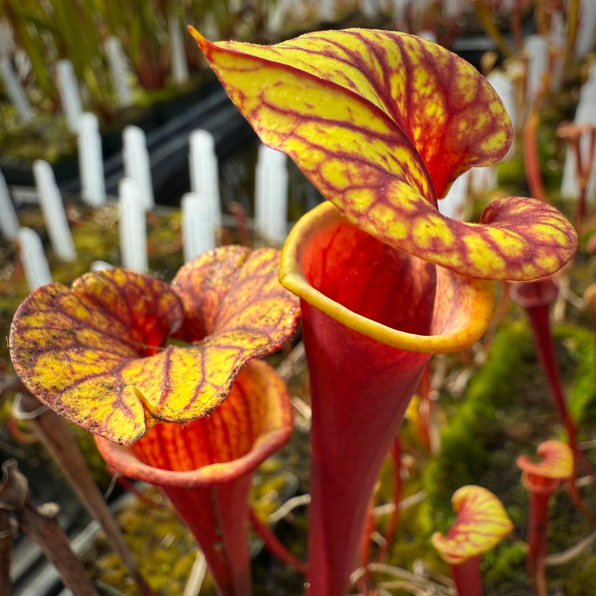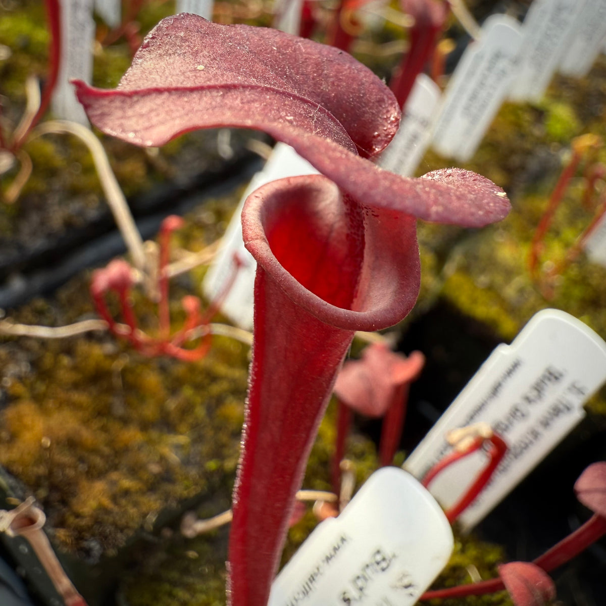 Sarracenia flava var. atropurpurea “Our Darkest” x flava var rugelii ‘Bud’s Gargoyle’ is a fantastic seed-grown batch of Sarracenia that we expect to have broad, impressive lids and wide, open mouths! The coloration is scarlet-red with bright yellow lids and mouth, although a few are a striking all-red! We expect these pitchers to be quite tall when mature.