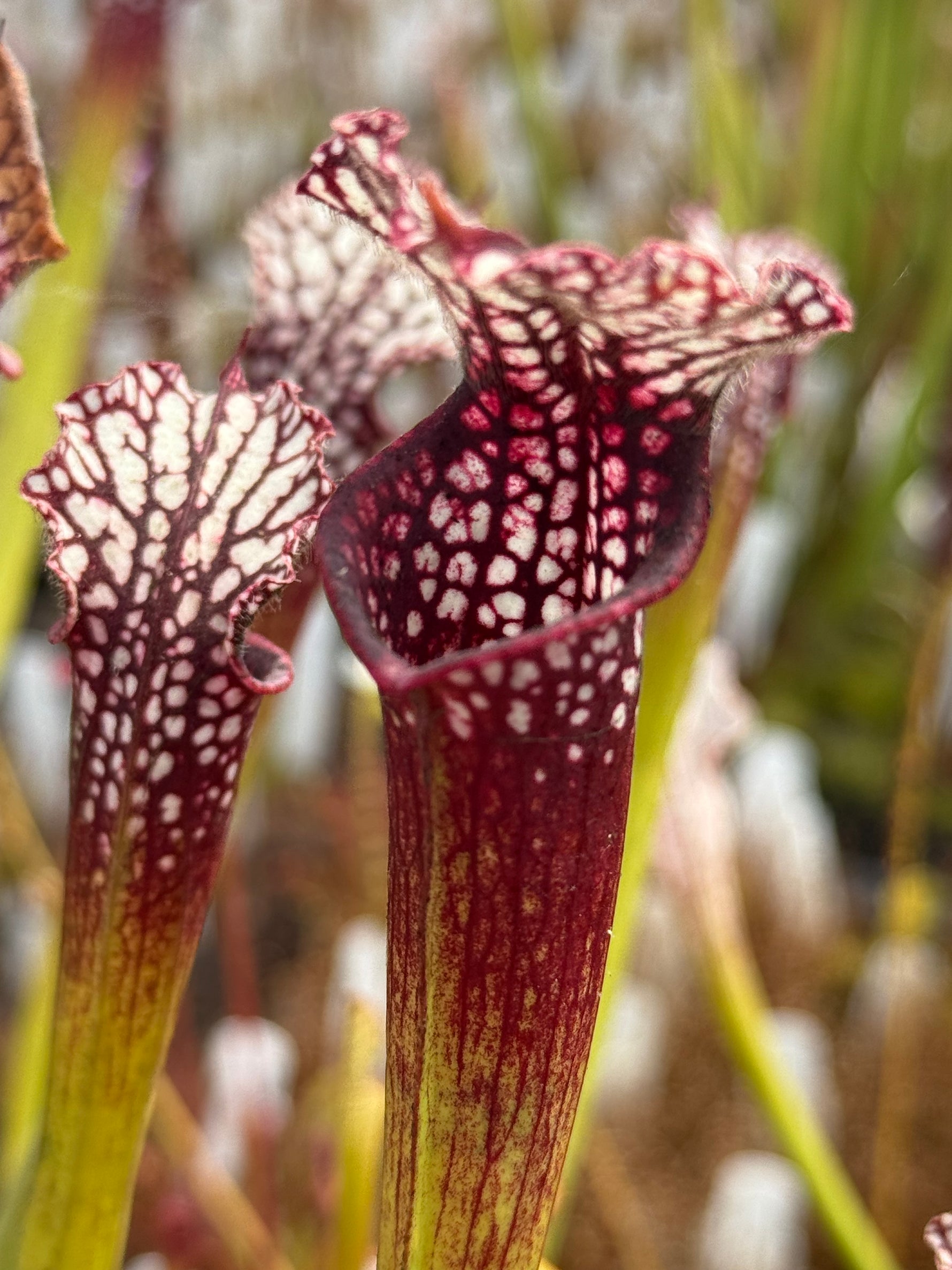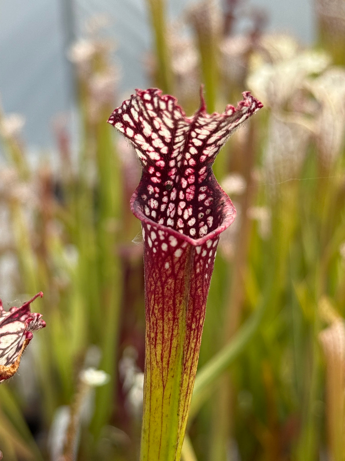 Growth Habit: Sarracenia primarily grow along the Southeastern coastal plain of the United States. They grow pitchers, which are modified leaves, seasonally that can vary in height, color, and size depending on the species or hybrid. The pitchers can die back during the growing season, but new pitchers will grow throughout the spring and summer. The pitchers start to grow in spring, and many grow as the year progresses; in summer, they will be at their best. In summer, you may see brown or black on your pitchers, which can be normal nectar burn or crisping from heat. As Fall comes on, the pitchers may start to die back, turning brown, and by winter, many or all of the pitchers are brown, but the rhizome remains healthy and intact throughout winter dormancy even if you cannot see anything growing. Sarracenia have brown, black, or white roots and do not generally have many of them. The rhizome can be brown and still be healthy.