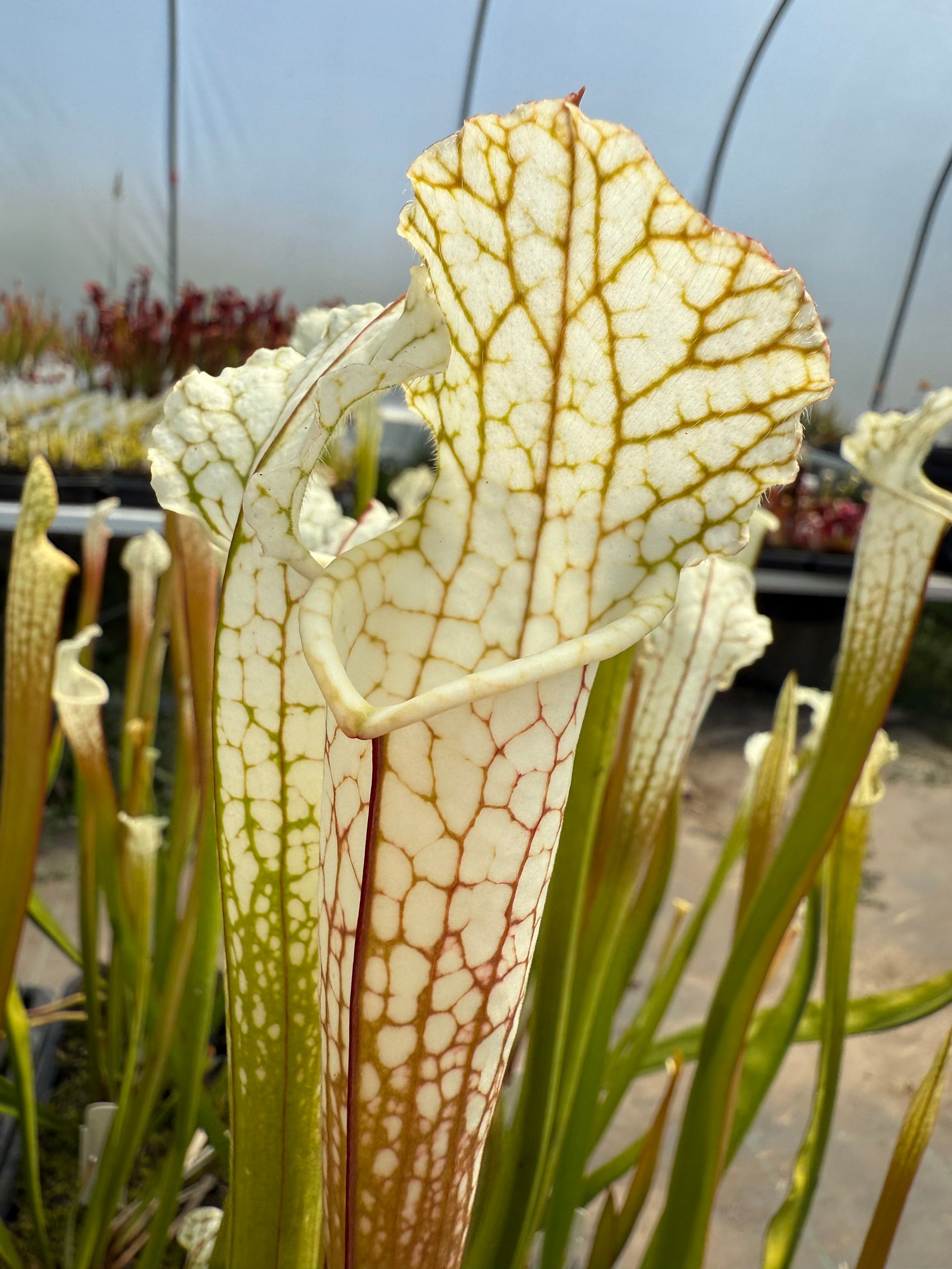 Sarracenia leucophylla ’Hurricane Creek White’ is legendary! Unfortunately all of the plants were destroyed and the site was turned into a highway overpass several years ago. This site was always known to have some of the most beautiful leucophylla; the upper part of the pitchers were all almost entirely white with little to no venation. Luckily, before it was destroyed, seeds were collected. These seedlings were created by us by crossing two of the original plants!