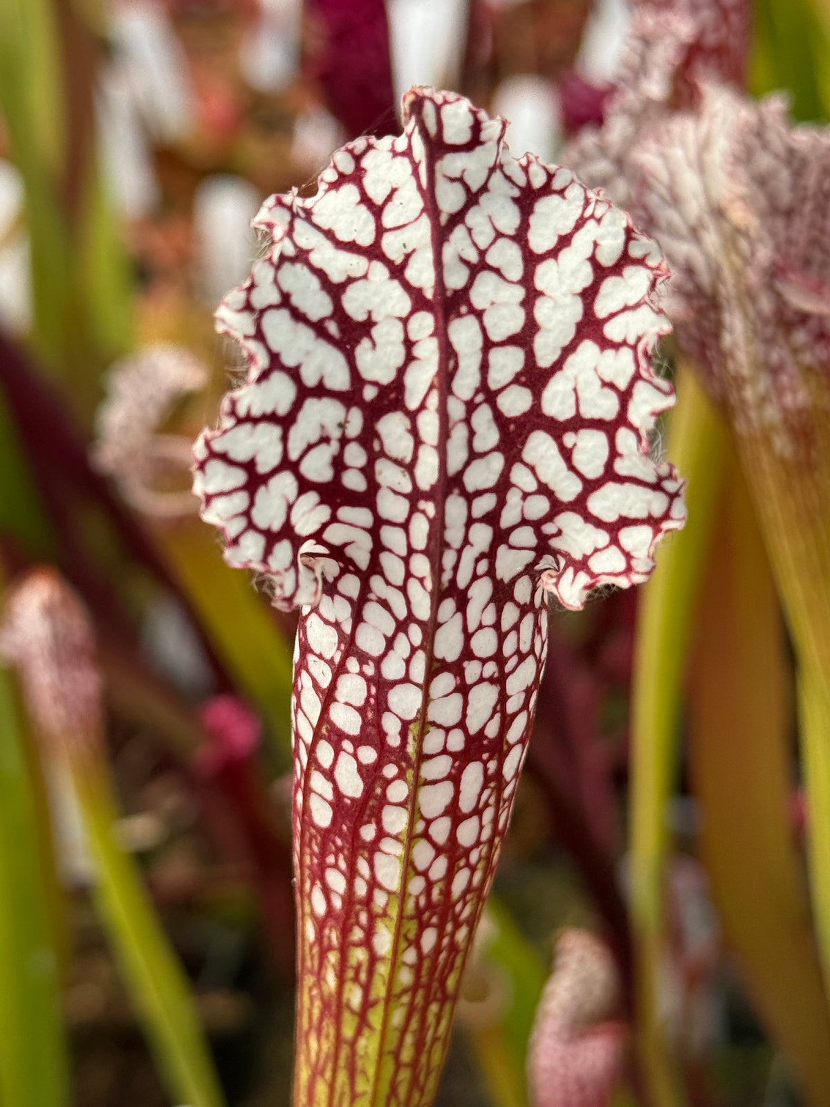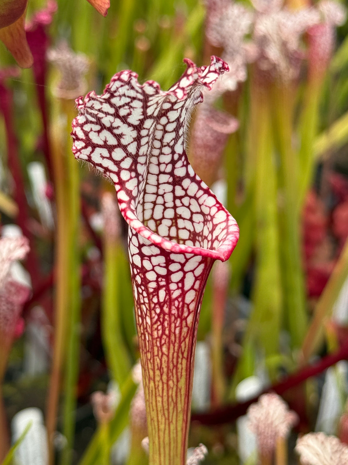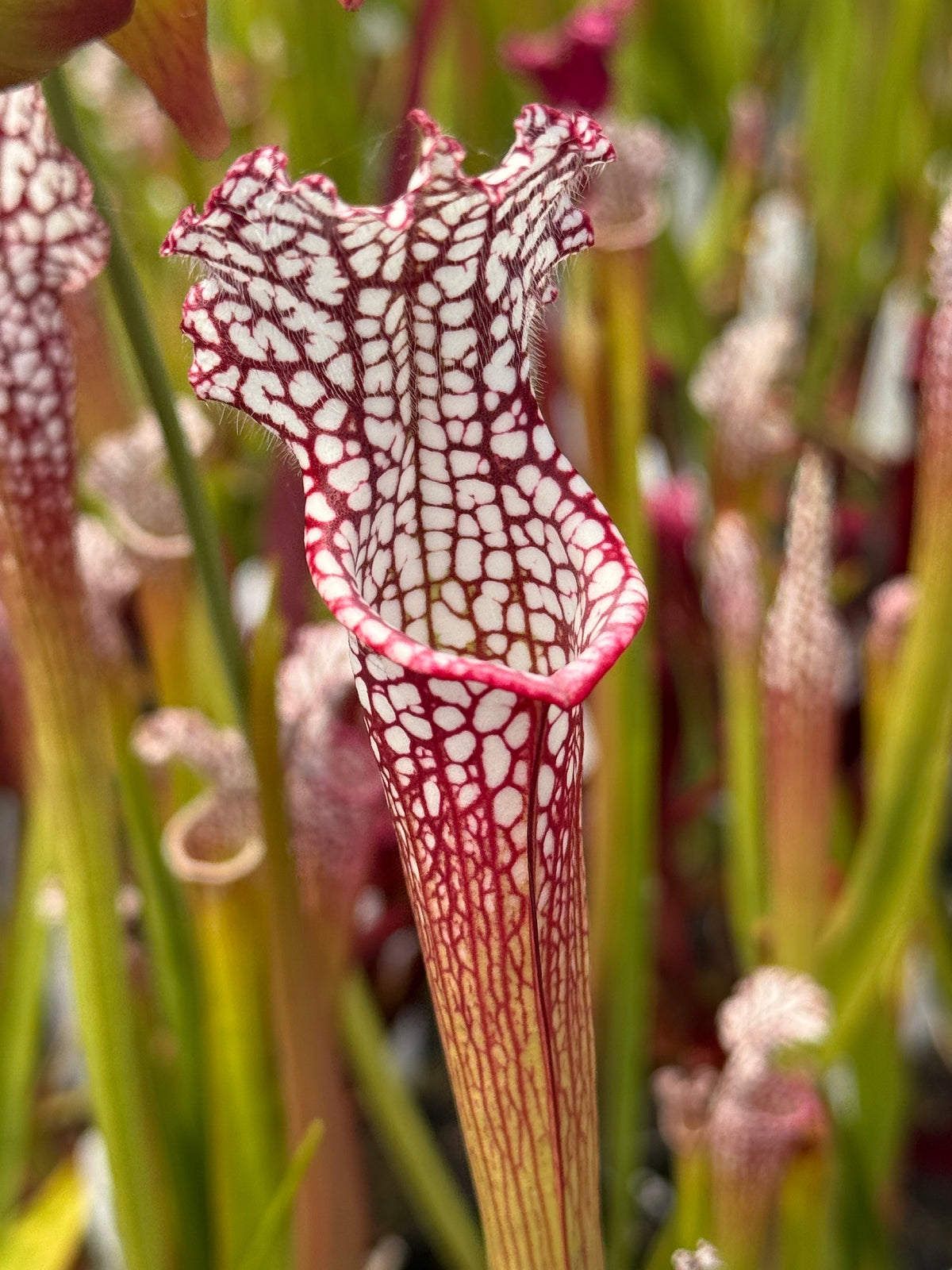 Sarracenia leucophylla, the white trumpet, is considered by many to be the most beautiful species of American pitcher plant. It produces large, red-petaled flowers as tall as 3 feet! The first pitchers of the season are usually thinner and more delicate than the second crop of pitchers produced in late summer to early autumn. These later pitchers put on a spectacular show; they can be as tall as the flowers were in spring! The pitchers are variable, with the lower part of the tubes green, tan, or purplish red. The upper portion of the tube, mouth, column, and lid are nearly pure white, laced with a network of veins in green to pink to red to purple.