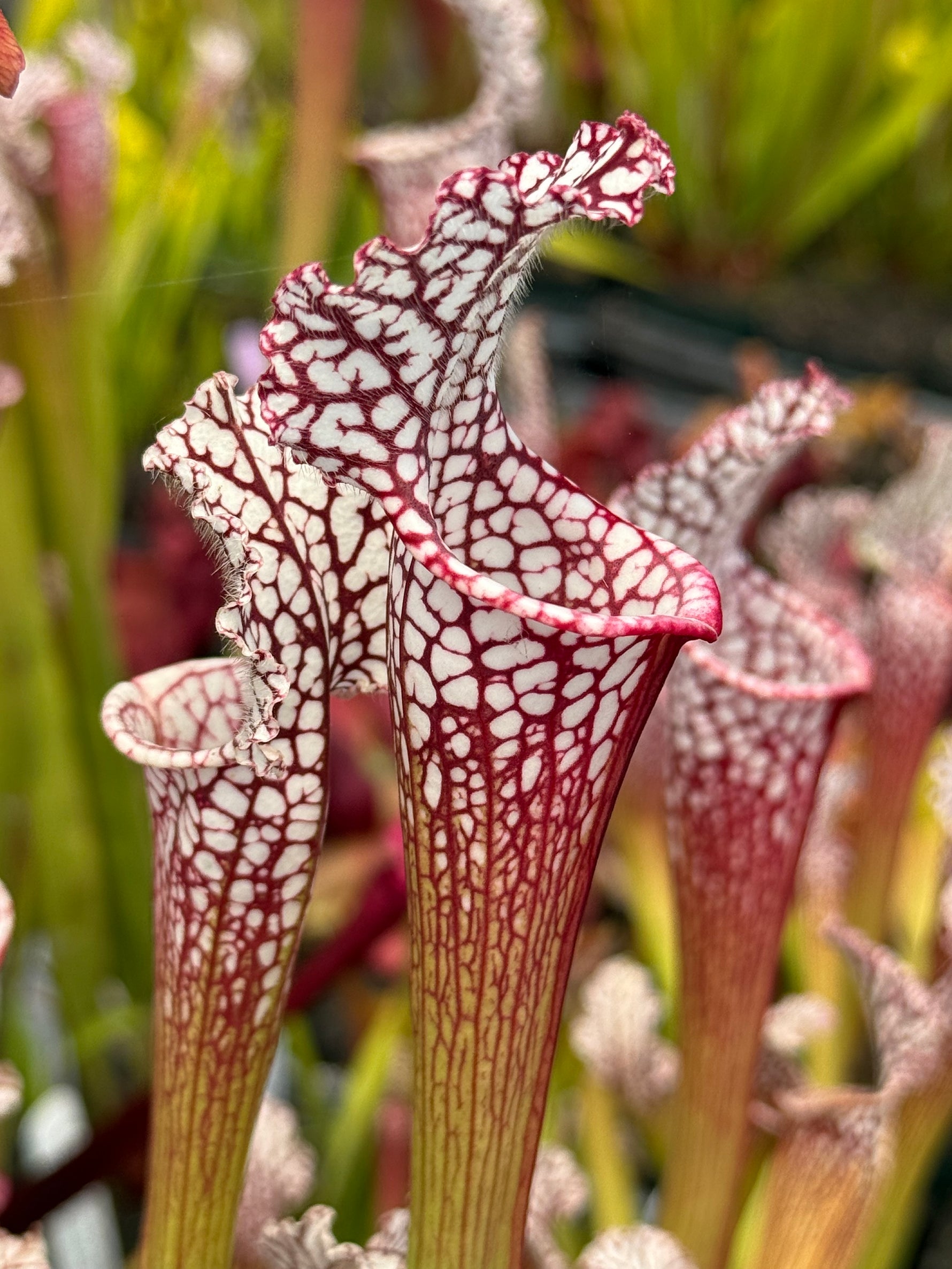 These plants are from Sumter County, Georgia, grown from horticulturally produced seed. This is the last leucophylla site in Georgia and is known for leucophylla with short, slightly upturned, ruffled lids! We grow a few different siblings from a selfing done at UC Berkeley. These are extremely rare divisions of select clones; we have marked them as Clones A-D.