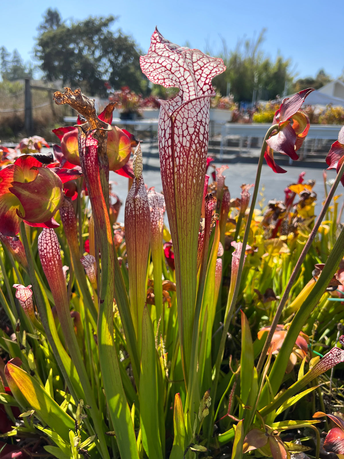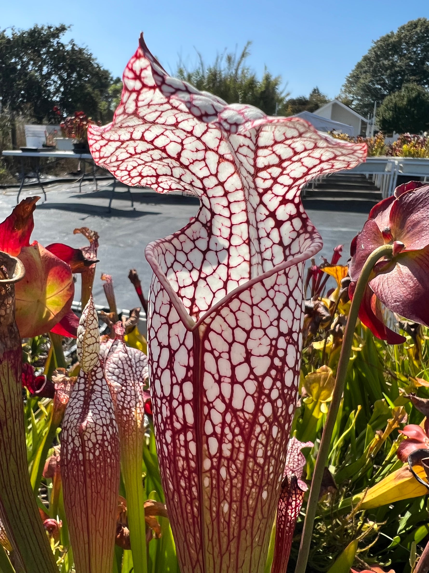This tall, large-throated leucophylla has exceptional red coloration running up and down the pitchers; vibrantly red at the base, the red splits off into dark red veins rippling across the luminously white pitcher mouth and lids. The red coloration and deep red venation tends to carry over into crosses made with this plant and it’s a must have for the Sarracenia collector and breeder!