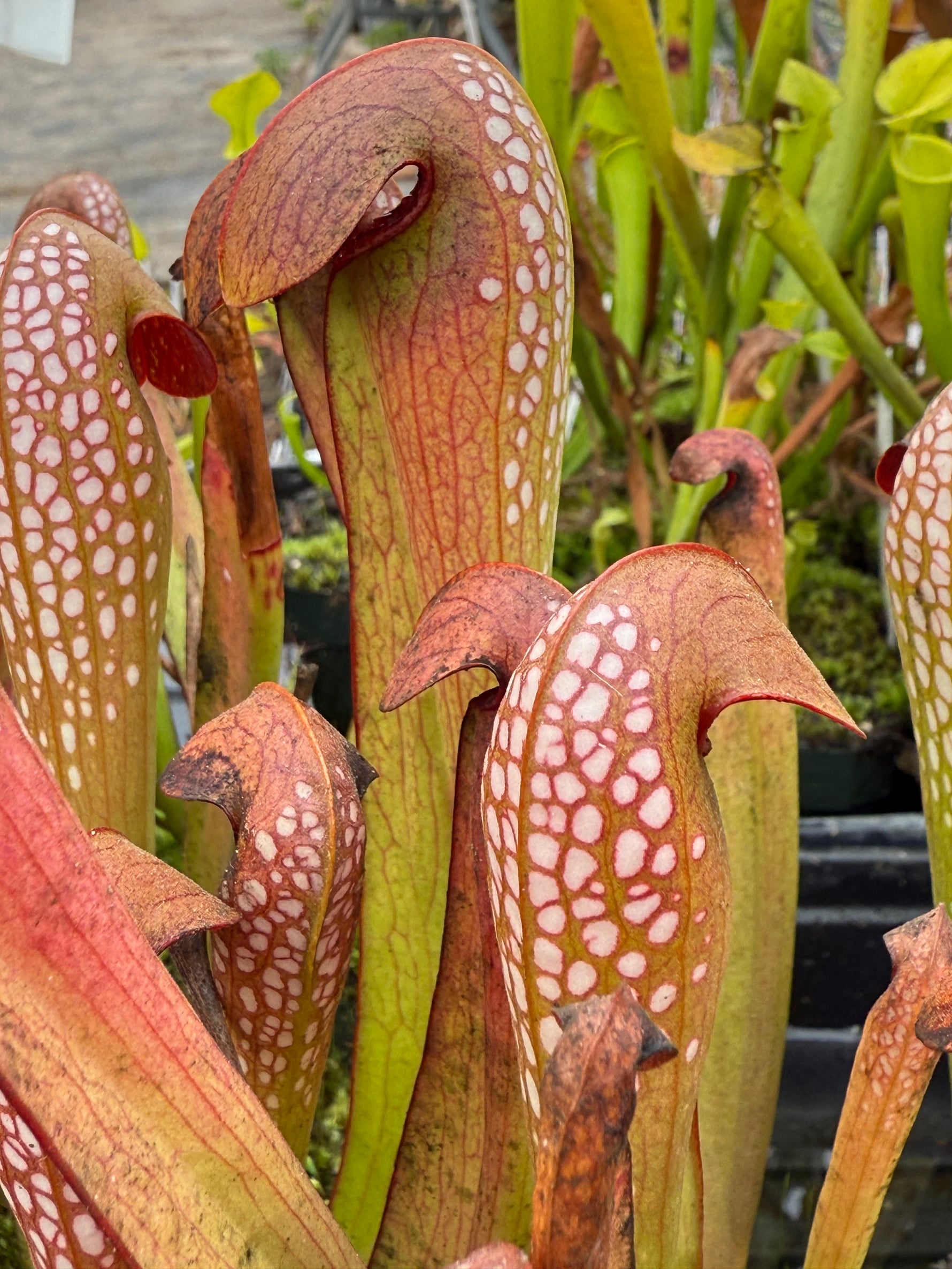 Growth Habit: Sarracenia primarily grow along the Southeastern coastal plain of the United States. They grow pitchers, which are modified leaves, seasonally that can vary in height, color, and size depending on the species or hybrid. The pitchers can die back during the growing season, but new pitchers will grow throughout the spring and summer. The pitchers start to grow in spring, and many grow as the year progresses; in summer, they will be at their best. In summer, you may see brown or black on your pitchers, which can be normal nectar burn or crisping from heat. As Fall comes on, the pitchers may start to die back, turning brown, and by winter, many or all of the pitchers are brown, but the rhizome remains healthy and intact throughout winter dormancy even if you cannot see anything growing. Sarracenia have brown, black, or white roots and do not generally have many of them. The rhizome can be brown and still be healthy.