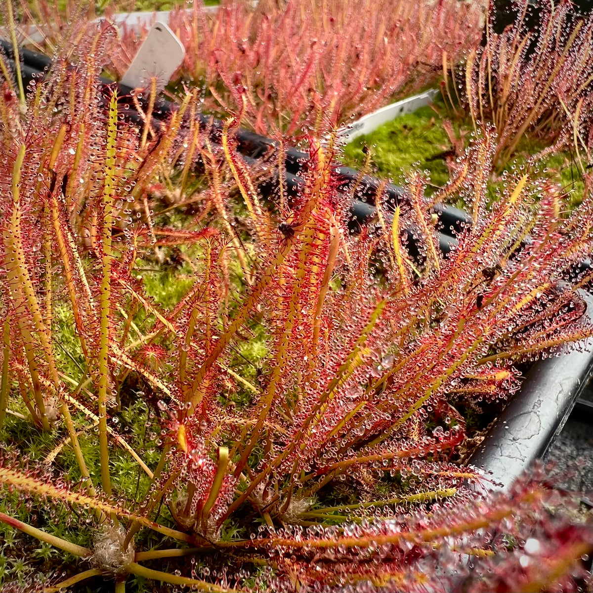 This is a cold hardy natural and very rare cross of Drosera intermedia and Drosera filiformis var filiformis. It is found in New Jersey. It forms clumps over time and looks like an adorable miniature thread leaf sundew. This is one of our more popular hybrids and the New Jersey clone is a little more cold hardy and a little oranger than other hybrida!