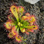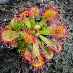 Growth Habit: This is a rosetted sundew meaning it grows leaves in a round, rosetted pattern. New leaves grow from the crown and older leaves die back, the plant will grow taller on brown stalks with the older leaves building up under the new leaves, forming a tall skirt of old leaves. It is normal for these plants to have high leaf turnover, meaning the leaves die back frequently and new leaves grow in. This is a compact species, usually no larger than 2-3” across. It forms pretty flowers and can easily be grown from seed. Sundews have black roots generally, do not be alarmed when you see the roots are black!
