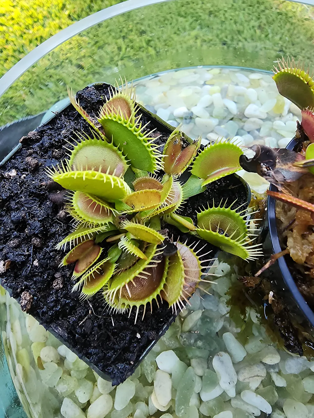 Sun: Full sun. Venus flytraps require lots of direct sun to grow and produce traps. In many areas, they can be grown outdoors in full sun. If you live in a very hot AND very dry place like Arizona or Sacramento, for example, you will want to grow your plants in full morning sun with protection from the afternoon sun or under 30% shade cloth. It is common for several traps/leaves to "burn" and die back when you first place your plant into the sun; your plant is acclimating to your conditions, and in most cases, new leaves will soon grow and be fully acclimated. Venus flytraps can be grown indoors, on extremely sunny windowsills, that receive all-day sun, but they will require a grow light in most circumstances due to the amount of light the plant needs. Grow lights should be 6-12” from the plant, depending on the light, and on a 10-12 hour day length. Venus flytraps generally are not a good candidate for a terrarium as they need intense light and good airflow. Grow outdoors if possible for best results.