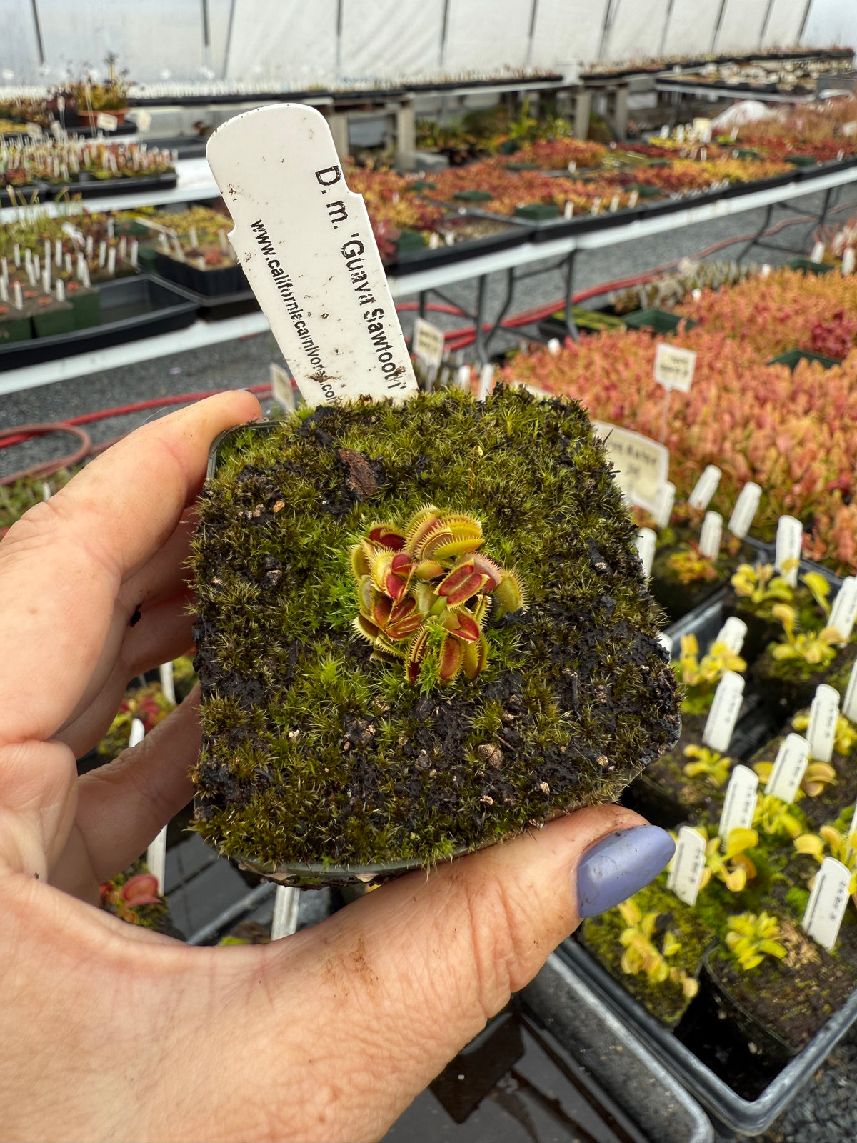 Dionaea m. 'Guava Sawtooth’ is a charming, sawtooth style cultivar with low-lying traps and bright red interiors. There’s something extra pleasing about this cultivar; maybe it’s the delicate fringe or maybe it’s the soft, warm colors! Whatever it is, we love it!