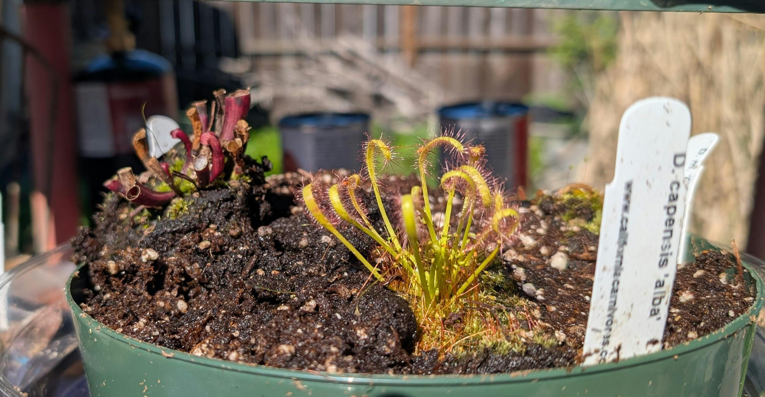 Water:Always keep them in a saucer with a few inches of distilled, rainwater, or reverse osmosis water. Never let them dry out, especially in the hot summer months. These are bog plants that prefer water-logged conditions unless you live somewhere both very hot AND extremely humid, like Alabama. In that case, let the water tray dry out for a day or two between refills. Always use distilled, reverse osmosis, or rainwater only. These plants are especially sensitive to their water quality, and giving them mineral and salt-free water is very important. In winter, when the plants are dormant, you can let them dry out a bit between rain storms, but do not let the soil get so dry that it pulls away from the edges of the pots. Be sure to supplement water as needed in between rains in winter.